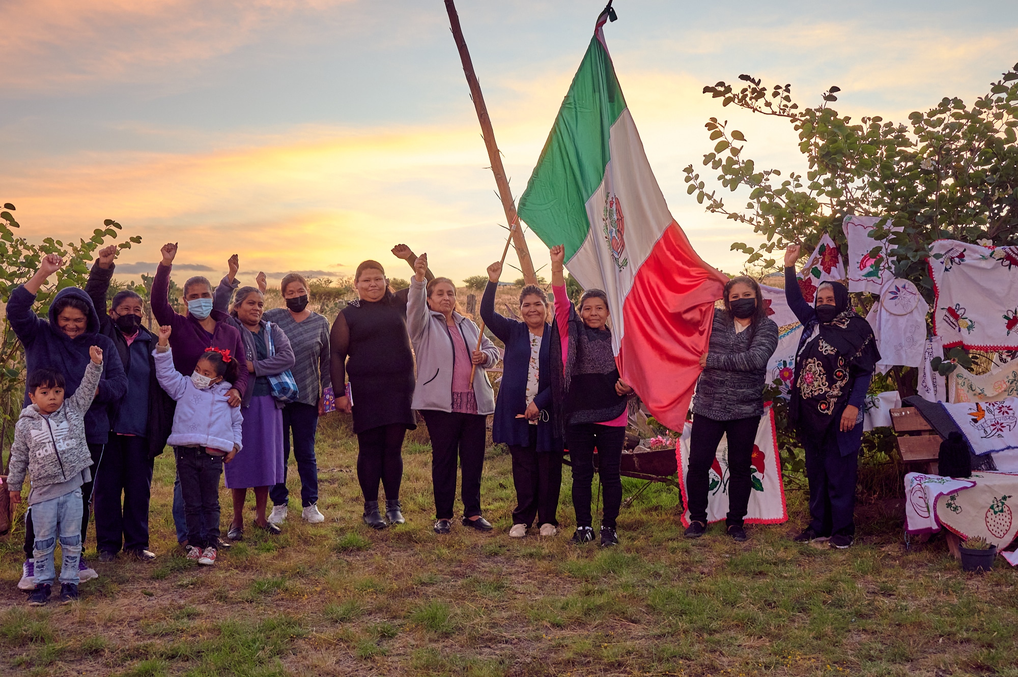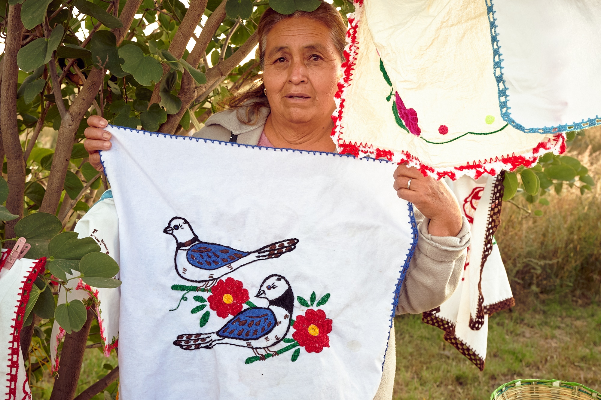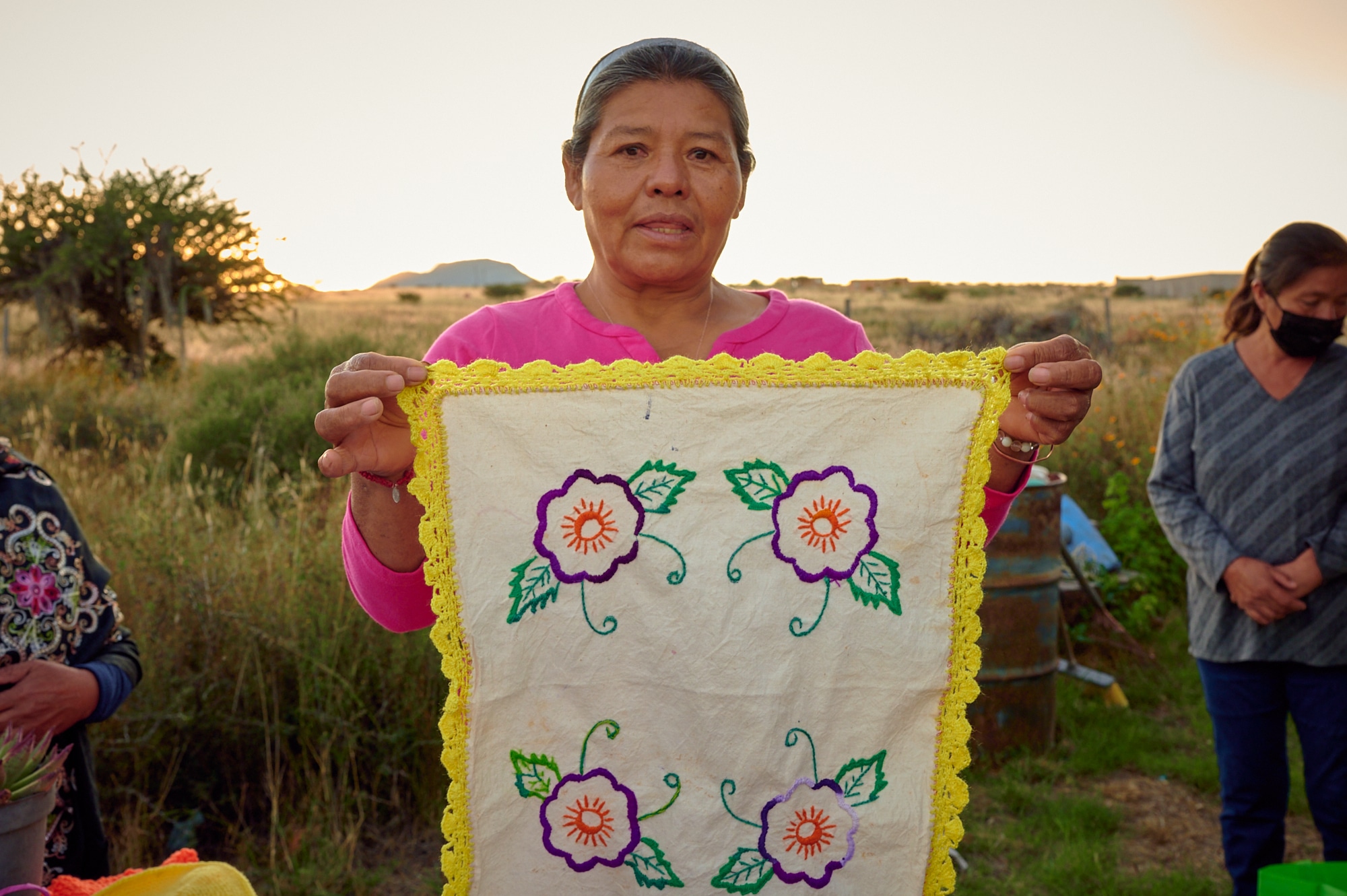 Las mujeres, que sostienen y lideran esta lucha, no descansan, se mantienen vigilantes entre punto y cruz, algunas bordando servilleteros, otras tejiendo canastas. Algunas habían aprendidos de sus padres, otras fueron enseñadas por compañeras, inclusive nuevas generaciones se han sumado a aprender este olvidado arte. Más allá del trabajo de bordar como objeto material, sus obras representan su lucha y la bandera como principal bastión de una comunidad de la periferia que resiste a ser atropellada por un falso progreso que busca destruir los pocos recursos naturales que aún quedan en el valle.
