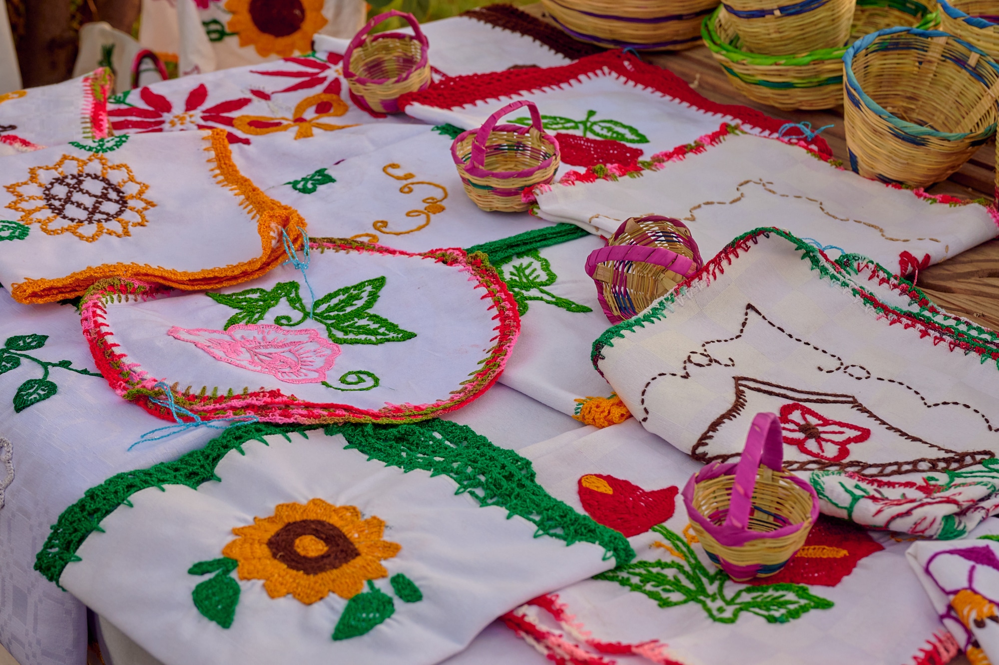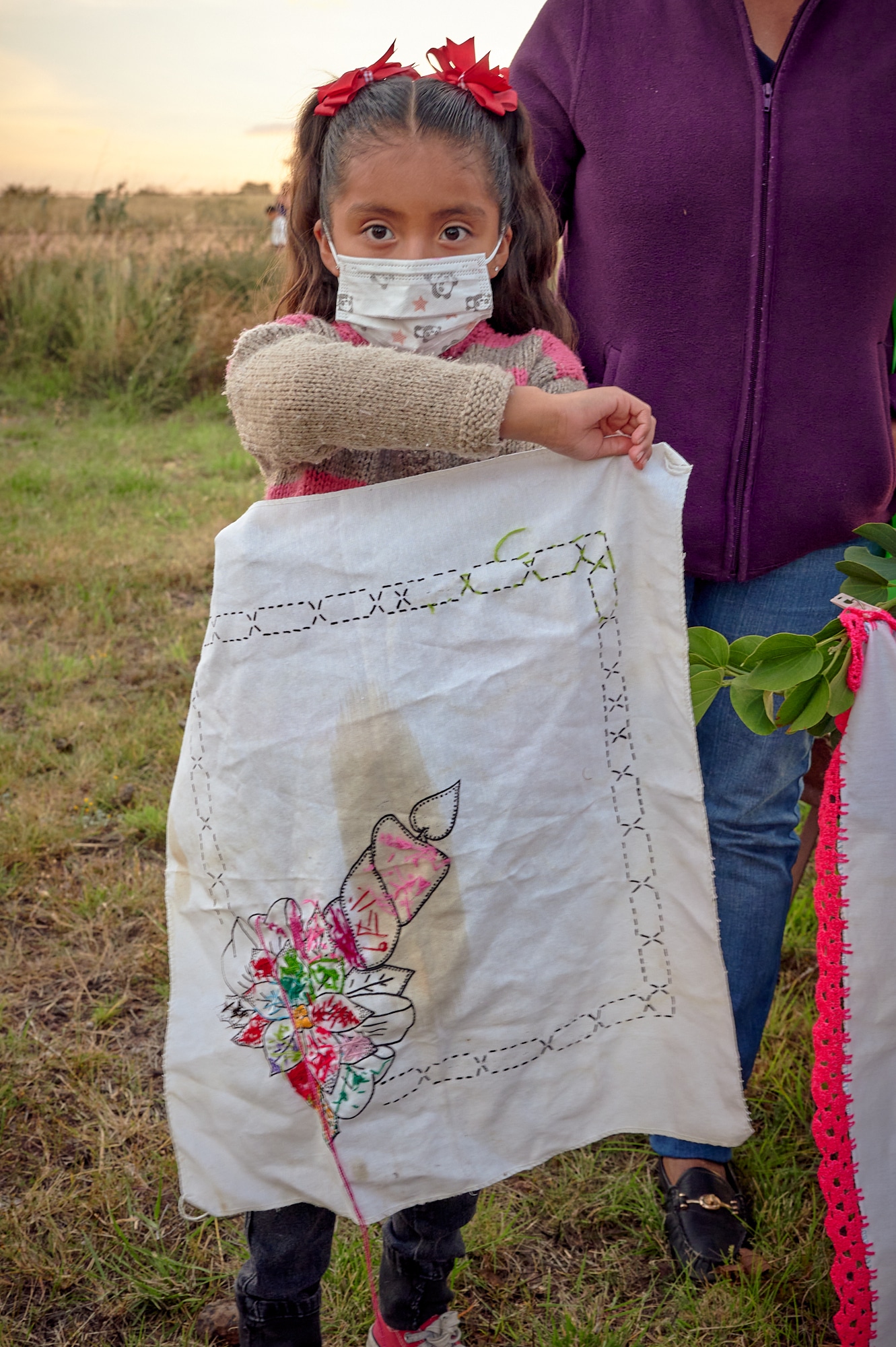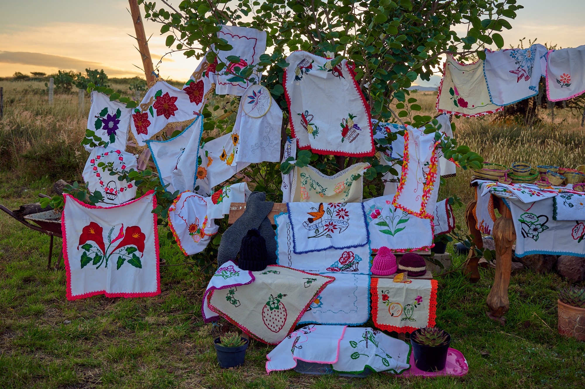Las mujeres, que sostienen y lideran esta lucha, no descansan, se mantienen vigilantes entre punto y cruz, algunas bordando servilleteros, otras tejiendo canastas. Algunas habían aprendidos de sus padres, otras fueron enseñadas por compañeras, inclusive nuevas generaciones se han sumado a aprender este olvidado arte. Más allá del trabajo de bordar como objeto material, sus obras representan su lucha y la bandera como principal bastión de una comunidad de la periferia que resiste a ser atropellada por un falso progreso que busca destruir los pocos recursos naturales que aún quedan en el valle.
