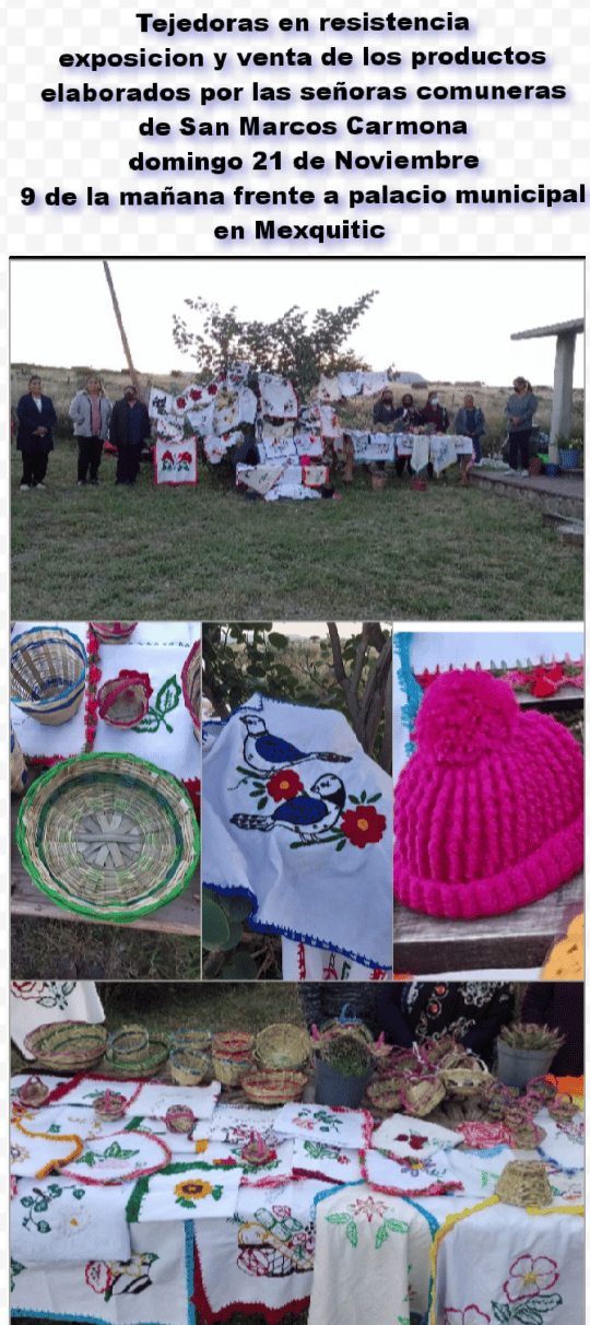 Parte de los trabajos serán puestos a la venta en una exposición que se realizará en la plaza frente al Palacio Municipal de Mexquitic de Carmona, a partir de las 9 de la mañana. Con la compra de artículos de la comunidad se apoya a la causa