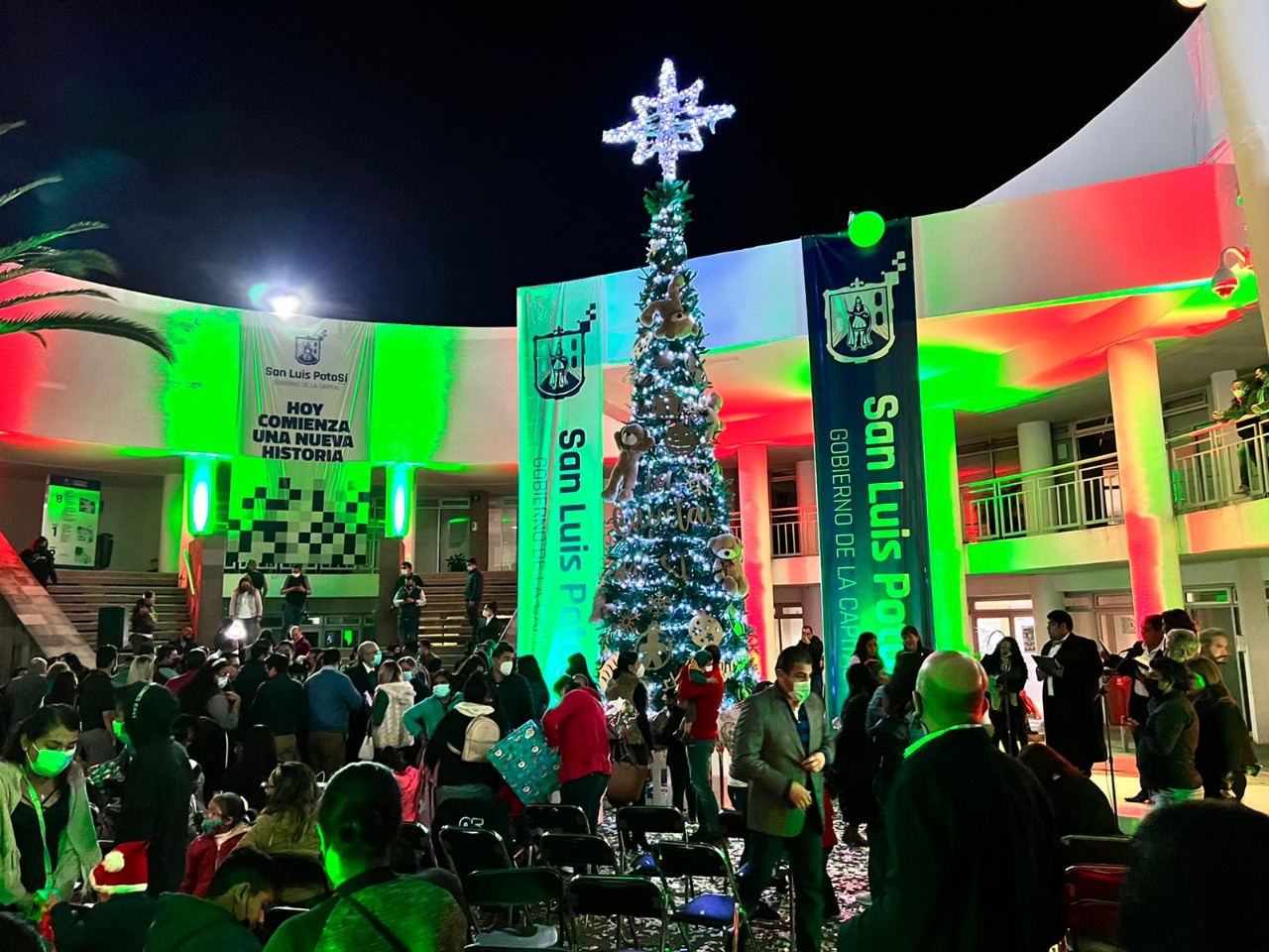 Al realizarse el encendido del árbol navideño, instalado en el patio central de la Unidad Administrativa Municipal, los pequeños del Jardín de Niños Municipal Salvador Nava Martínez recibieron obsequios navideños, de manos del presidente municipal, Enrique Galindo Ceballos; la presidenta del DIF municipal, Estela Arriaga Márquez; regidores, síndicos e integrantes del gabinete.
