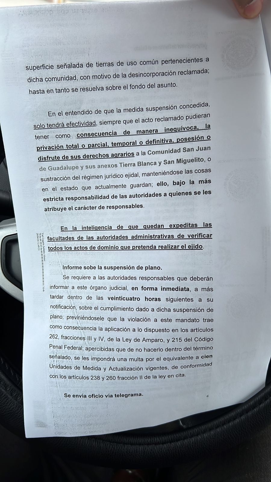 El día de ayer trascendió la suspensión por la vía de amparo promovida por una persona miembro del Frente Agrario Pro Familias de la Sierra de San Miguelito, suspensión concedida por Juzgado Cuarto de Distrito, y en el que se lee la siguiente sentencia: