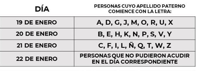 Los horarios son los regulares, de 9:00 a 17:00 horas y los días correspondientes al apellido son los siguientes: