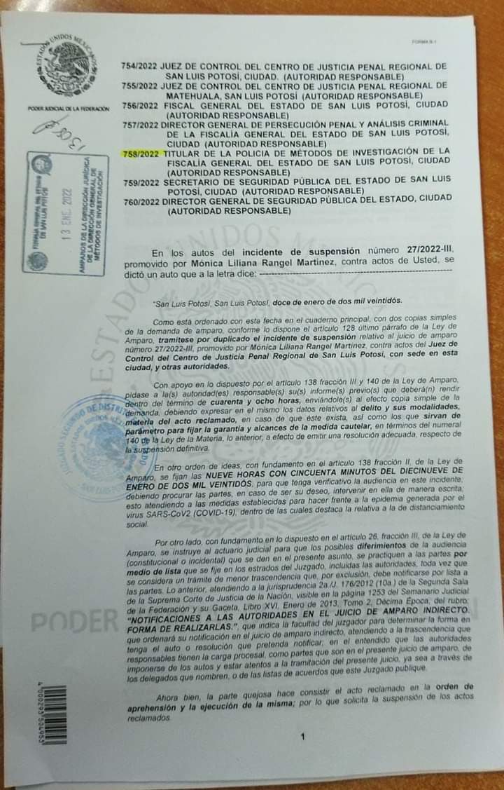 El Juzgado Segundo de Distrito, concedió la suspensión provisional contra orden de captura, recurso que fue solicitado desde el pasado 7 de enero. Este día 13 todas la autoridades contra las que va el amparo ya fueron notificadas.