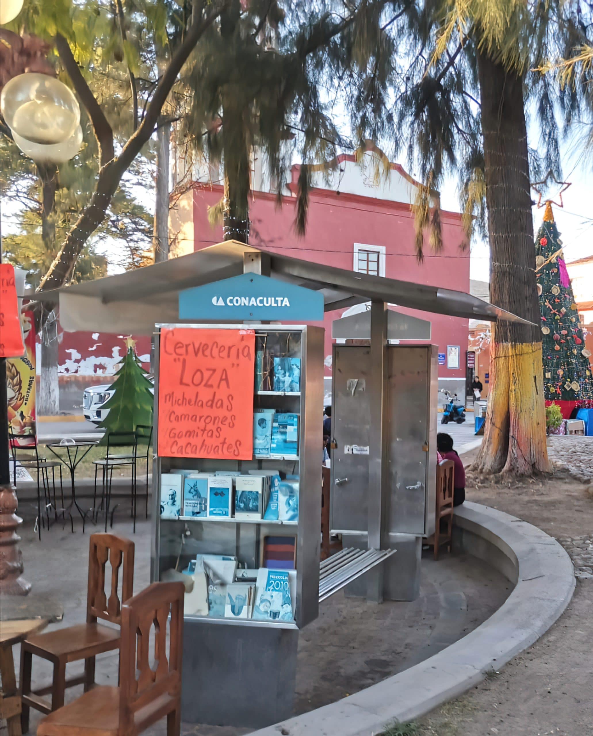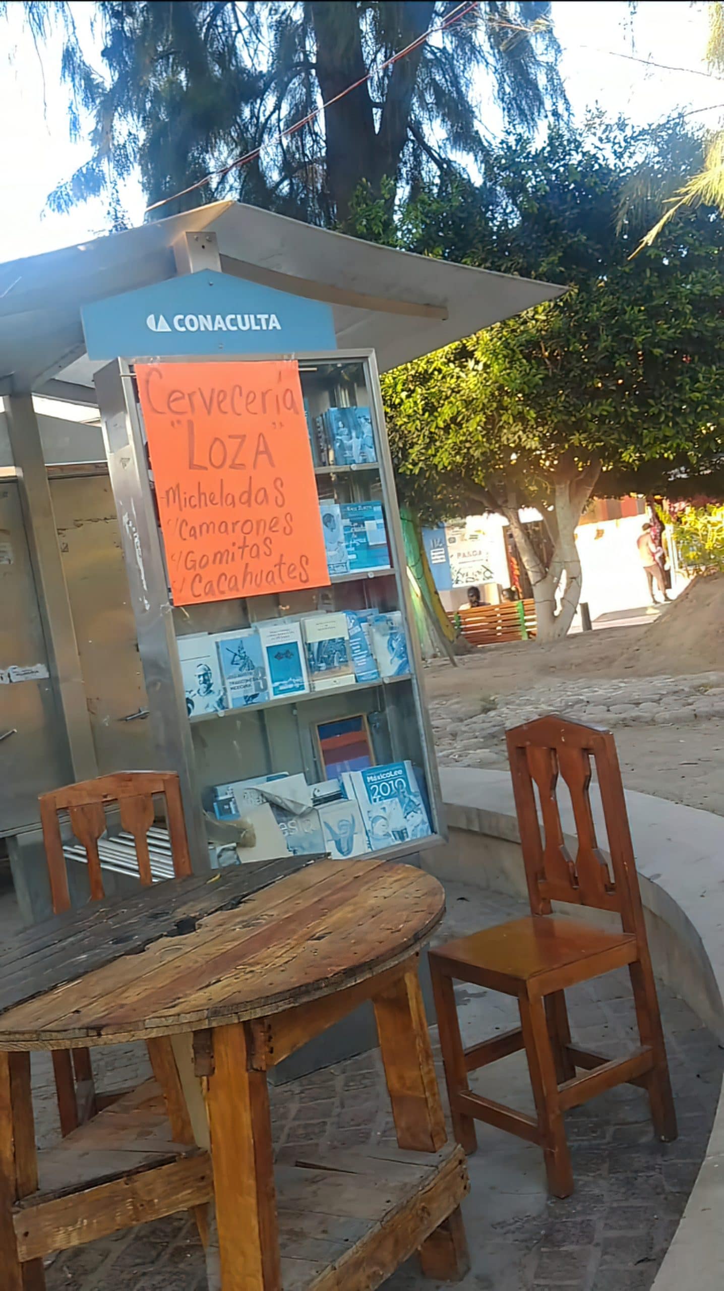 En fotografías se puede ver como un paralibro de los que tiene abandonado la Secretaría de Cultura, es usado para la venta  de micheladas, gomichelas y más.