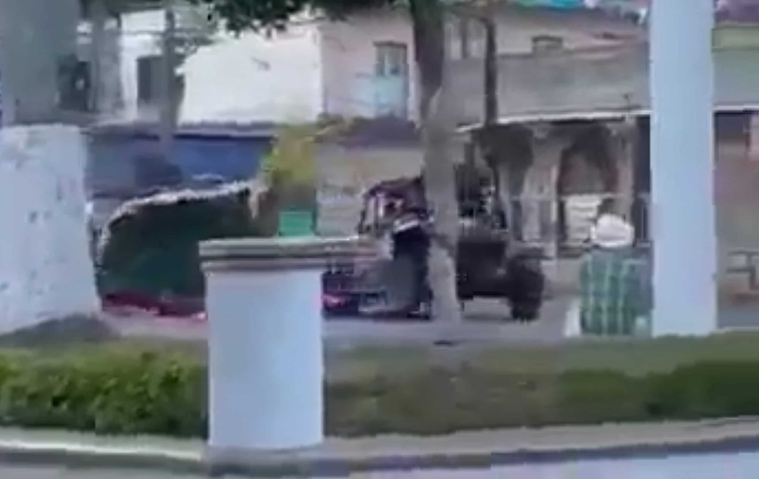 En video quedo captado el momento en que el sujeto conduce de forma temeraria sobre la zona peatonal, en reversa y sin miramientos. Además se centra frente al árbol de Navidad y con buena velocidad lo choca para derribarlo.