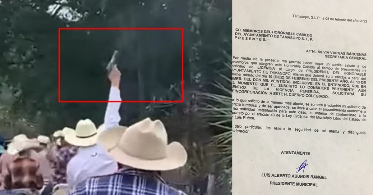 SLP.- Este día el Alcalde de Tamasopo, Luis Alberto Abundis, solicitó licencia al Cabildo para responder  un proceso penal en su contra tras difundirse un vídeo donde se le ve disparando un arma de fuego durante una cabalgata a mediados de enero en la localidad de “El Trigo”.