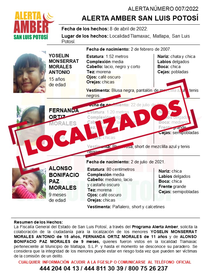 Se trata de Yoselín Monserrat Morales Antonio de 15 años de edad; Fernanda Ortiz Morales de 11 años de edad; y Alonso Bonifacio Paz Morales de 9 meses de edad.