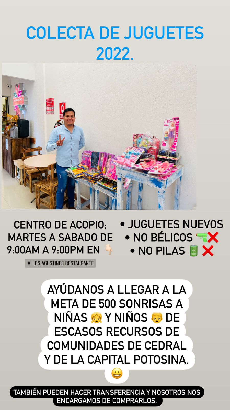 A las 5:00 pm del 12 de abril la Fundación Ayudemos al Prójimo SLP inició su colecta anual de juguetes para el día del niño, en el restaurante “Los Agustines” ubicado en Av. Universidad #505, frente a la iglesia de San Agustín en el Centro Histórico, en presencia de algunos medios de comunicación.