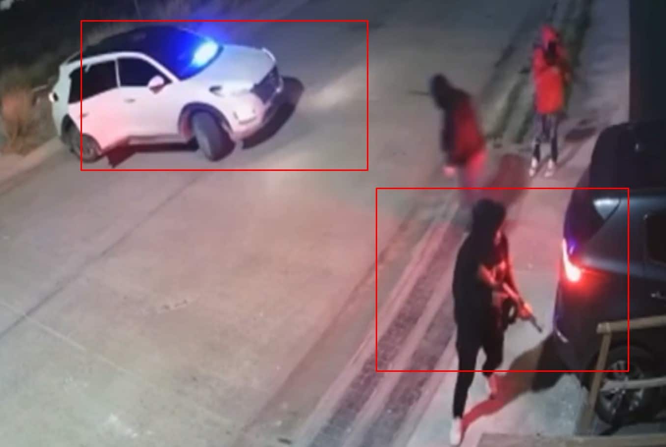 Por el lugar pasa un vehículo blanco sin placas el cual al notar la oportunidad, se echa de reversa, enciende su torreta y de éste bajan hombres con armas largas quienes de inmediato se acercan a las víctimas. Sin embargo, la mujer logra ingresar a la casa y al parecer el conductor también logra ponerse a salvo por lo que los criminales al ver frustrada su oportunidad deciden huir a todo prisa.