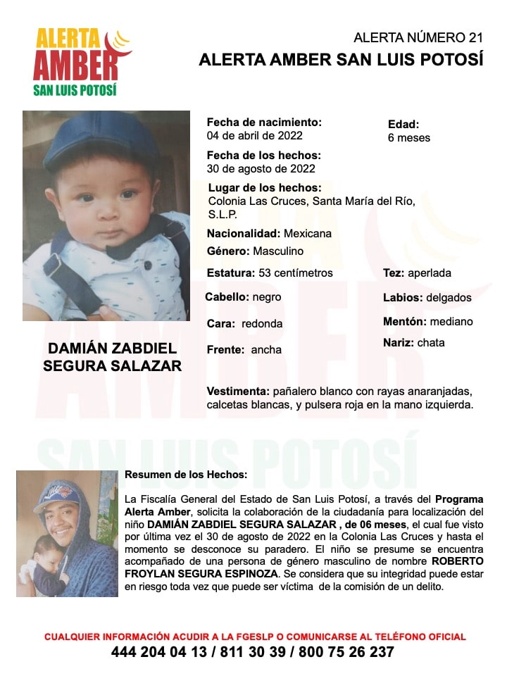 Cualquier información sobre su paradero, favor de acudir a la Fiscalía Especializada en Materia de Derechos Humanos, ubicada en Volcán Tacaná #115 Fraccionamiento Cumbres de San Luis, o comunicarse a los teléfonos 444 811 30 39 y/o al 800 75 26 237 lada sin costo.