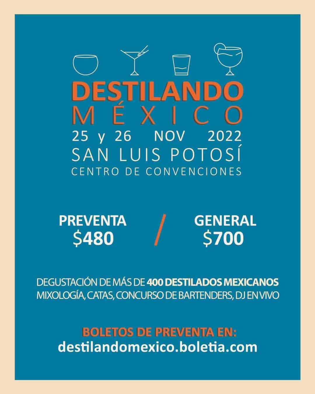 El Festival permitirá la degustación de 400 destilados mexicanos, mixología, catas, concurso de bartenders y DJ en vivo, en un horario de 19:00 a 1:00 horas;  además será posible comprar a precio de casa productora, todo con el objetivo de demostrar la gran calidad de los destilados nacionales a través de sus productores; así mismo, se ofrecerán pláticas y seminarios que lo hace muy atractivo para las y los visitantes de otras partes de México e incluso del extranjero, además de que se realizará en el Centro de Convenciones, un espacio con todas las amenidades y comodidades necesarias para este tipo de eventos. Las y los potosinos interesados podrán adquirir sus accesos en la página https://destilandomexico.boletia.com.