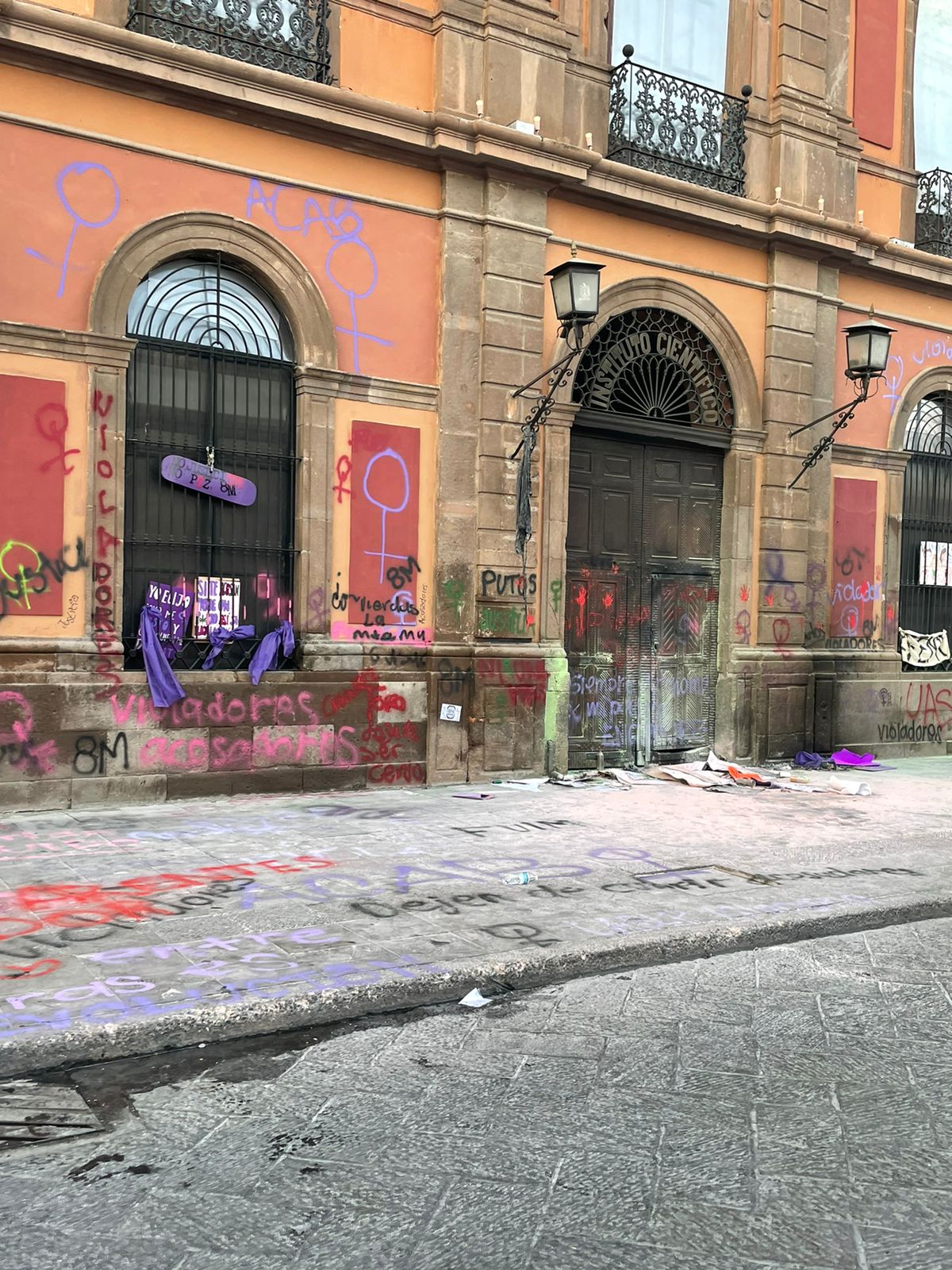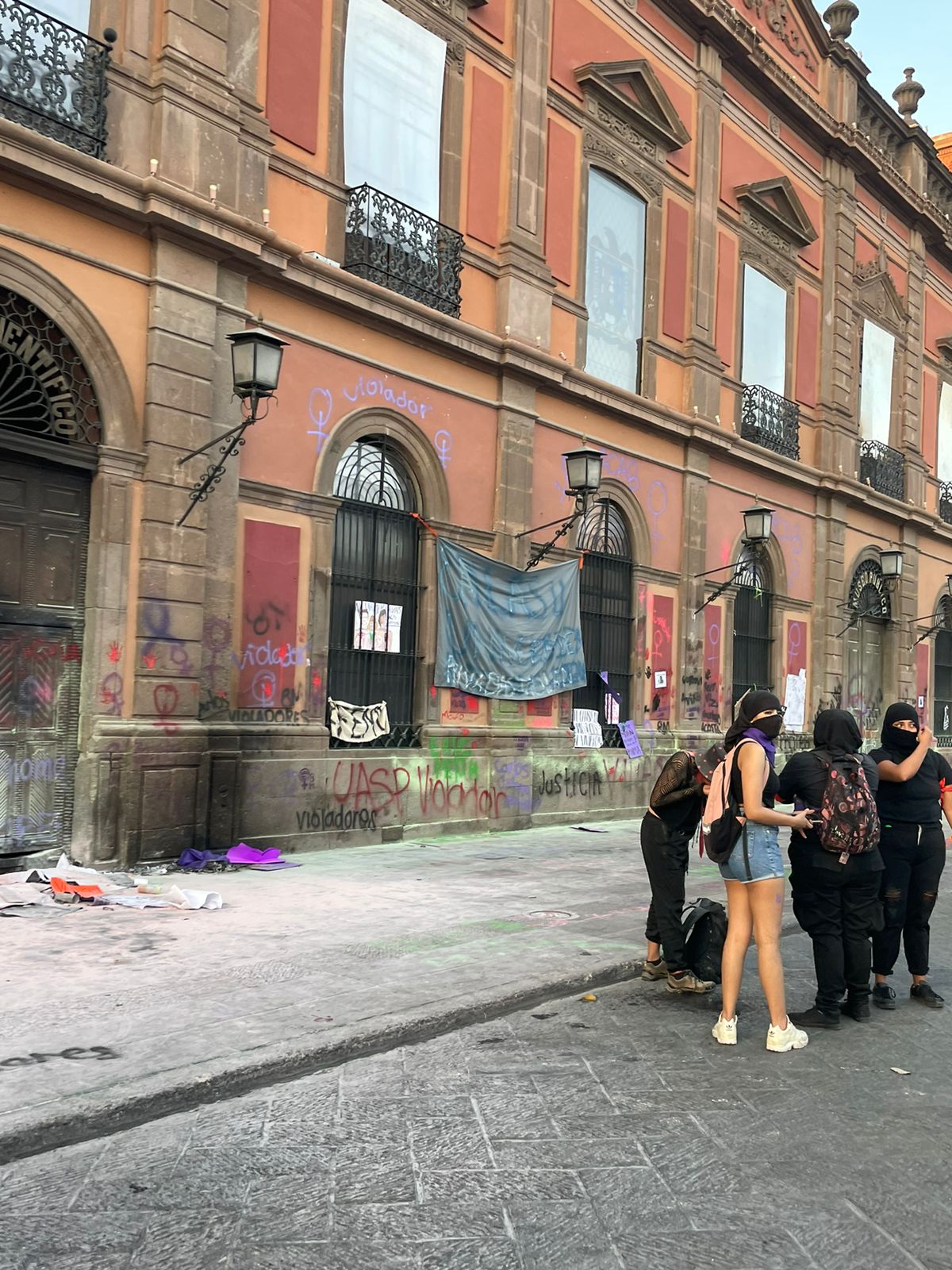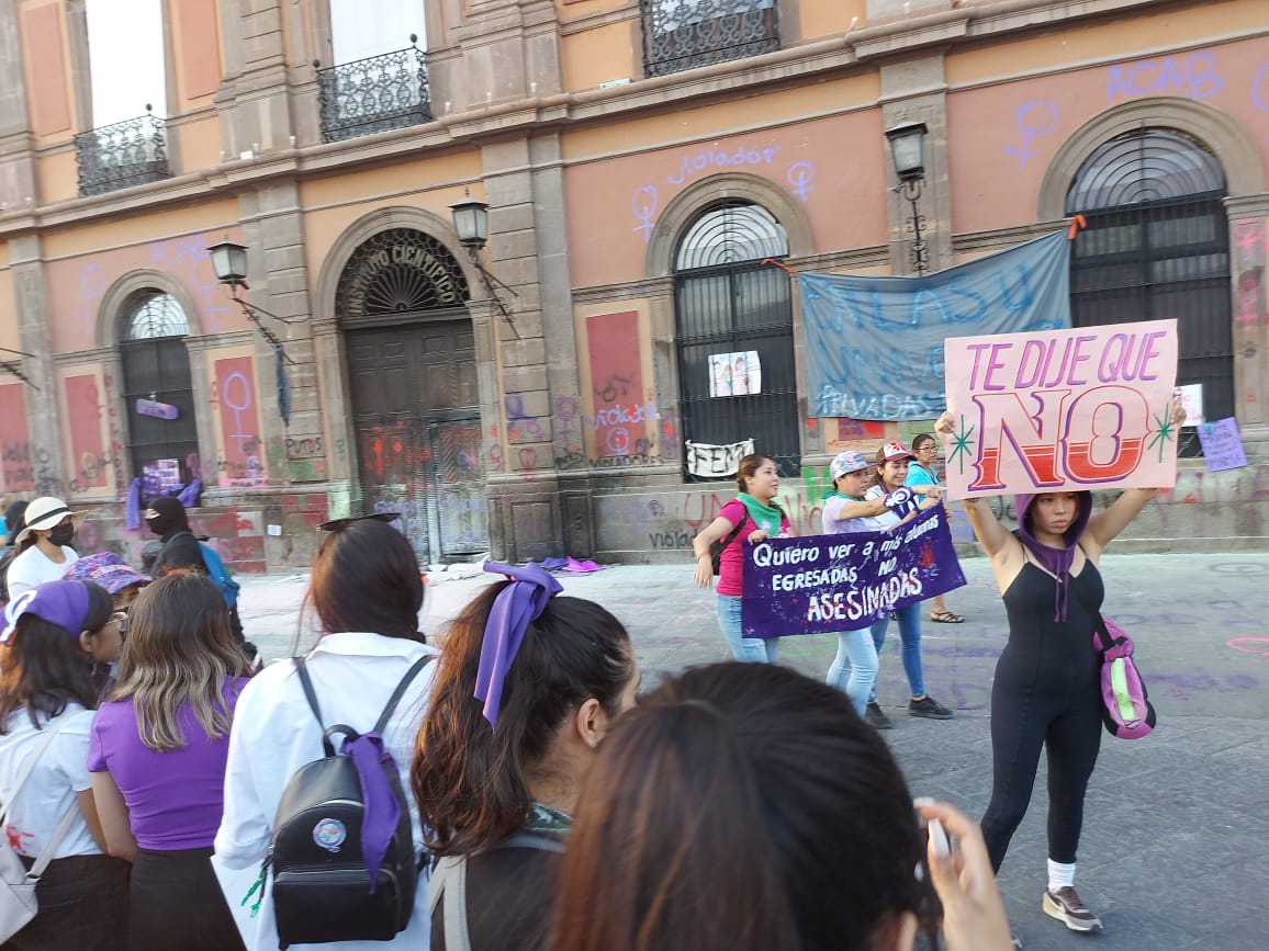 Finalmente el contingente marchó al edificio central de la Universidad Autónoma de San Luis Potosí, donde realizaron las mismas actividades pero además hubo una mayor descarga de enojo y descontento pues la institución ha sido acusada de encubrir a agresores de mujeres por muchos años años.