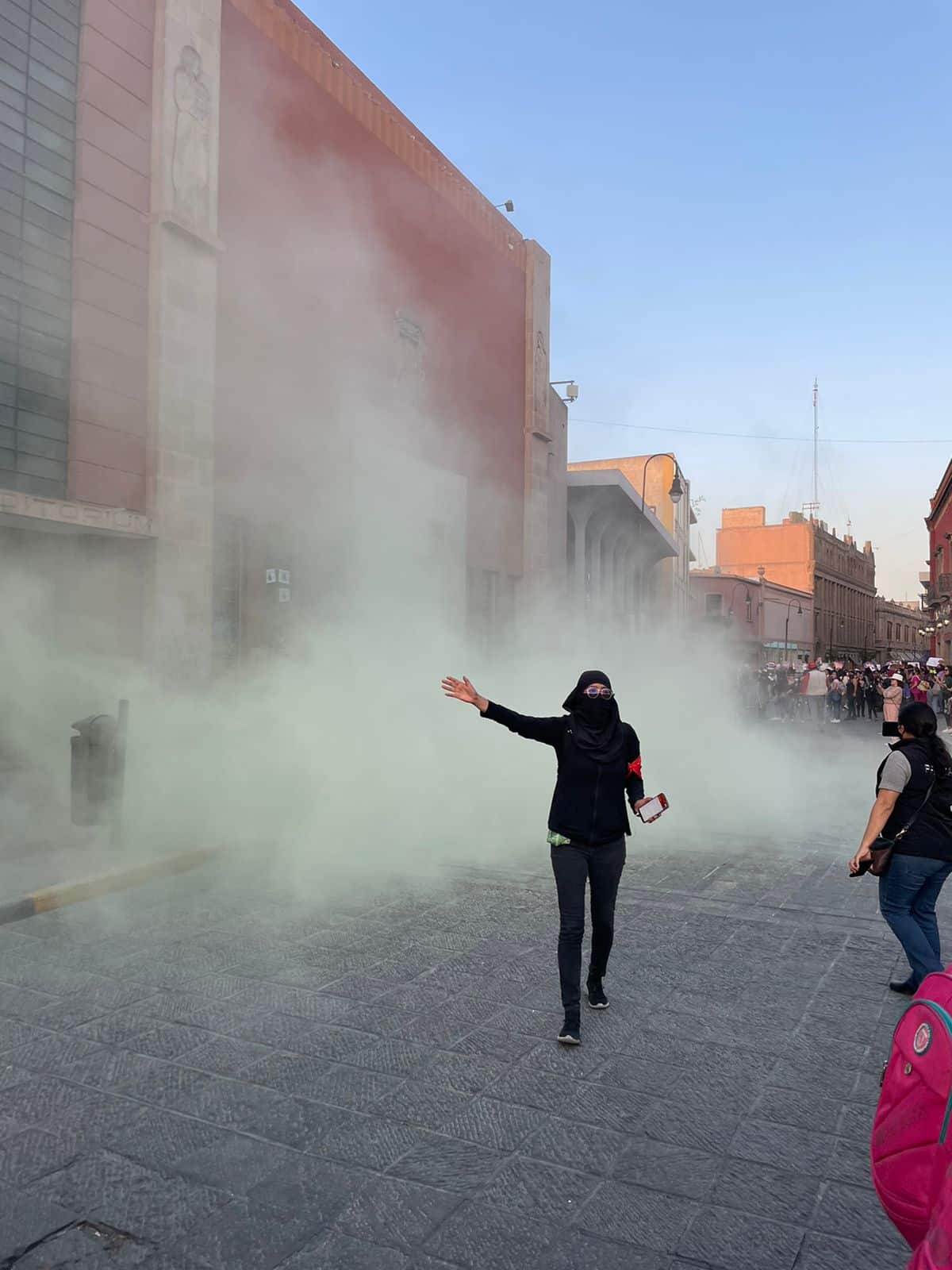 A pesar de que la UASLP habría informado que no tomaría acciones en contra del contingente, desde el interior de la librería se lanzó una gran cantidad de polvo de extintor lo que provocó momentos de asfixia a las asistentes, acto que fue reprochado por las manifestantes. Inclusive algunas comunicadores resultaron afectadas en su cobertura por la respuesta tomada por la UASLP.