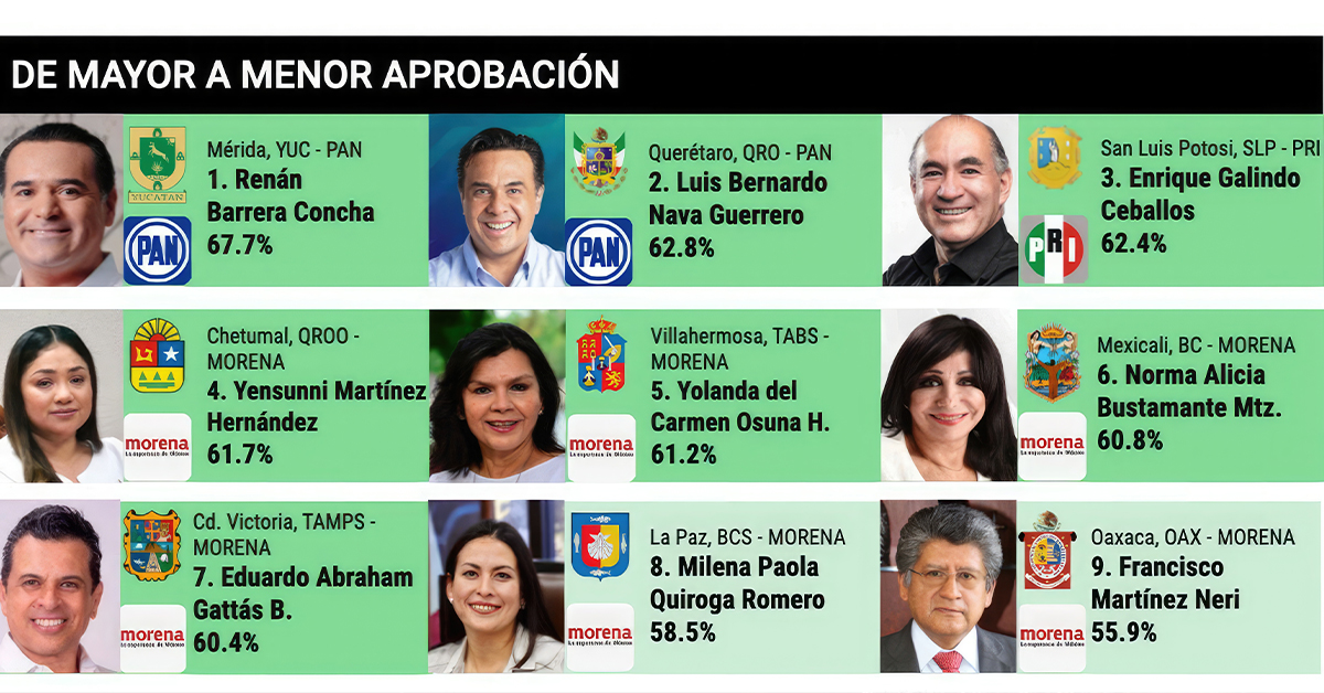 Los resultados que expuso México Elige ponen en primera posición al Presidente Municipal de Mérida, Yucatán, Renán Barrera Concha, con 67.7 puntos porcentuales; seguido de Luis Bernardo Nava, de Querétaro, con 62.8 por ciento de aprobación.