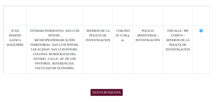 Luego de la citada detención, el sujeto mencionado fue certificado y trasladado a las Oficinas de la 2ª Coordinación de Aprehensiones de la Dirección General de Métodos de Investigación del Estado de San Luis Potosí, para llevarse a cabo la documentación correspondiente.