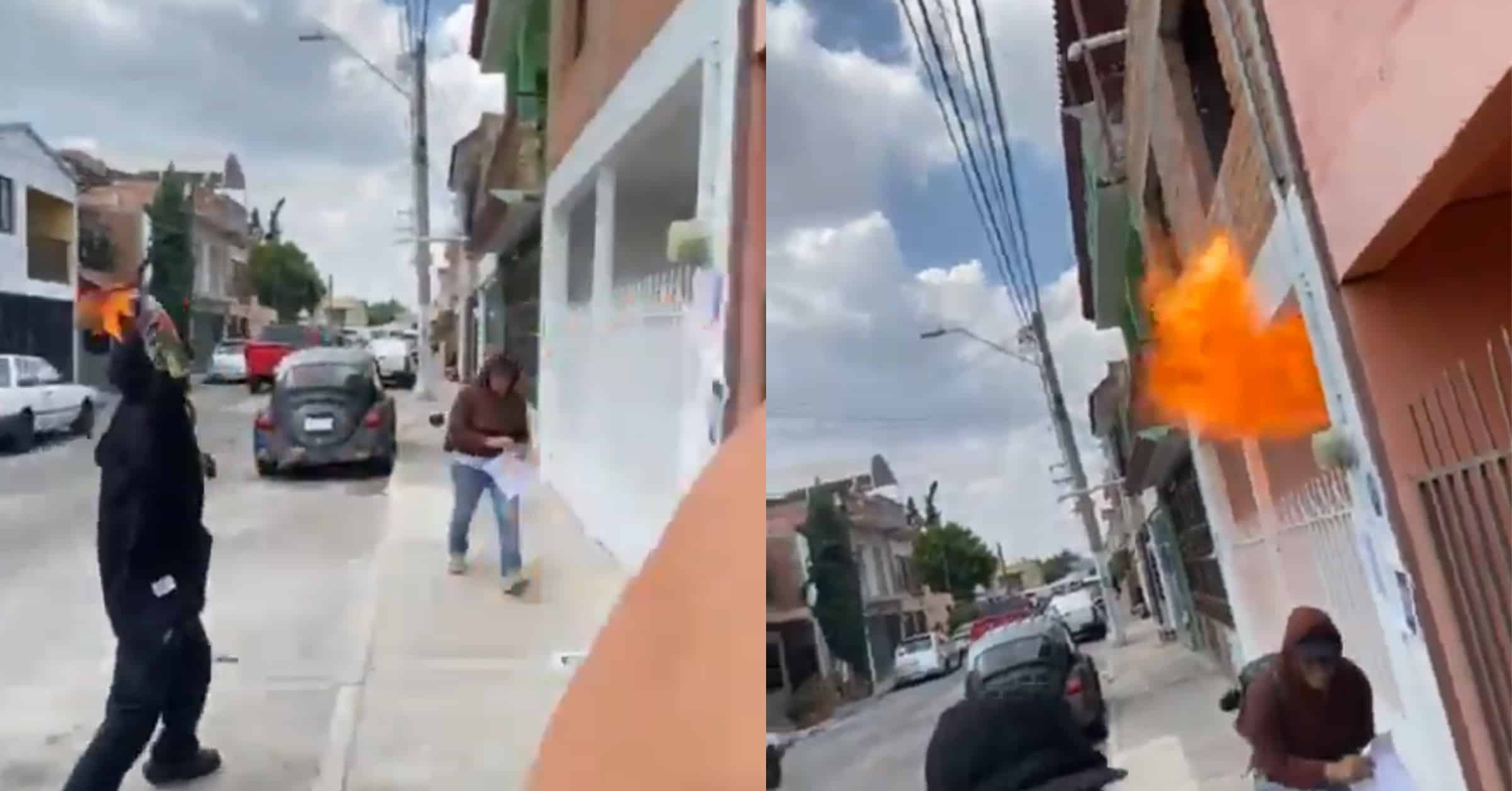 Las imágenes muestran a dos hombres vestidos de negro, con los rostros cubiertos, lanzando bombas molotov y huyendo mientras las llamas se extienden por el inmueble en la colonia Jesús Terán. Se puede ver a un tercer individuo recogiendo un objeto y corriendo.