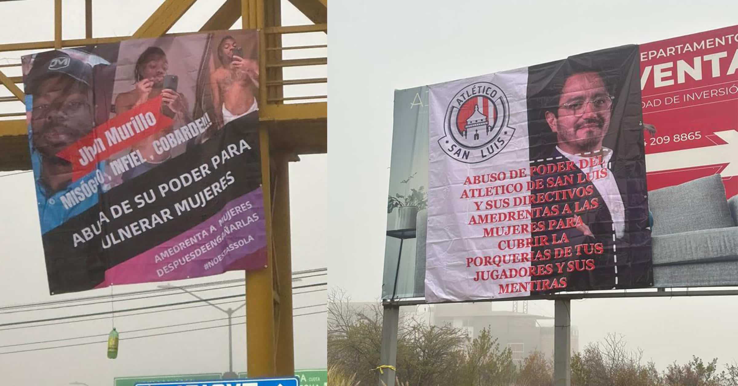 En una de las lonas, el rostro de Luis Mario Torres, un conocido directivo del equipo, es exhibido con la leyenda: “Abuso de poder del Atlético de San Luis y sus directivos amedrentas mujeres para cubrir la porquería de tus jugadores y sus mentiras”. La grave acusación no sólo sugiere abuso de poder por parte de Torres, sino también encubrimiento de acciones indebidas por parte de los jugadores del equipo.