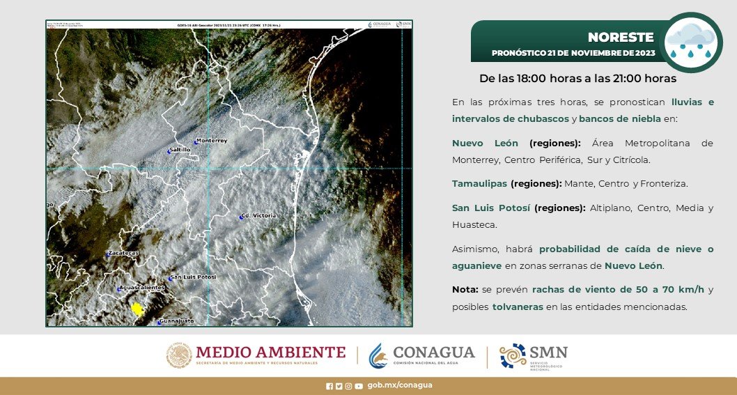 Una de las preocupaciones principales es la caída de aguanieve o nieve, que se prevé en estados como Chihuahua, Coahuila, Durango, Nuevo León y Zacatecas. Estas condiciones podrían afectar la visibilidad y el tránsito en carreteras, por lo que se recomienda precaución a los conductores y habitantes de estas áreas.