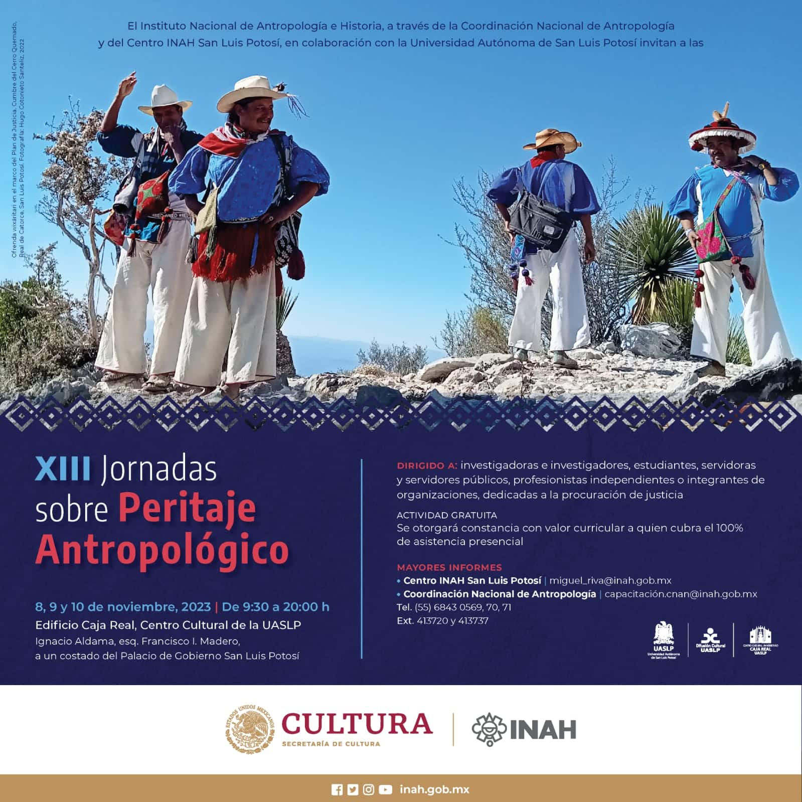 Para más información, los interesados pueden contactar al Centro INAH S.L.P a través del correo electrónico miguel_riva@inah.gob.mx o a la Coordinación Nacional de Antropología del INAH en capacitacion2@yahoo.com.mx y capacitación.cnan@inah.gob.mx.