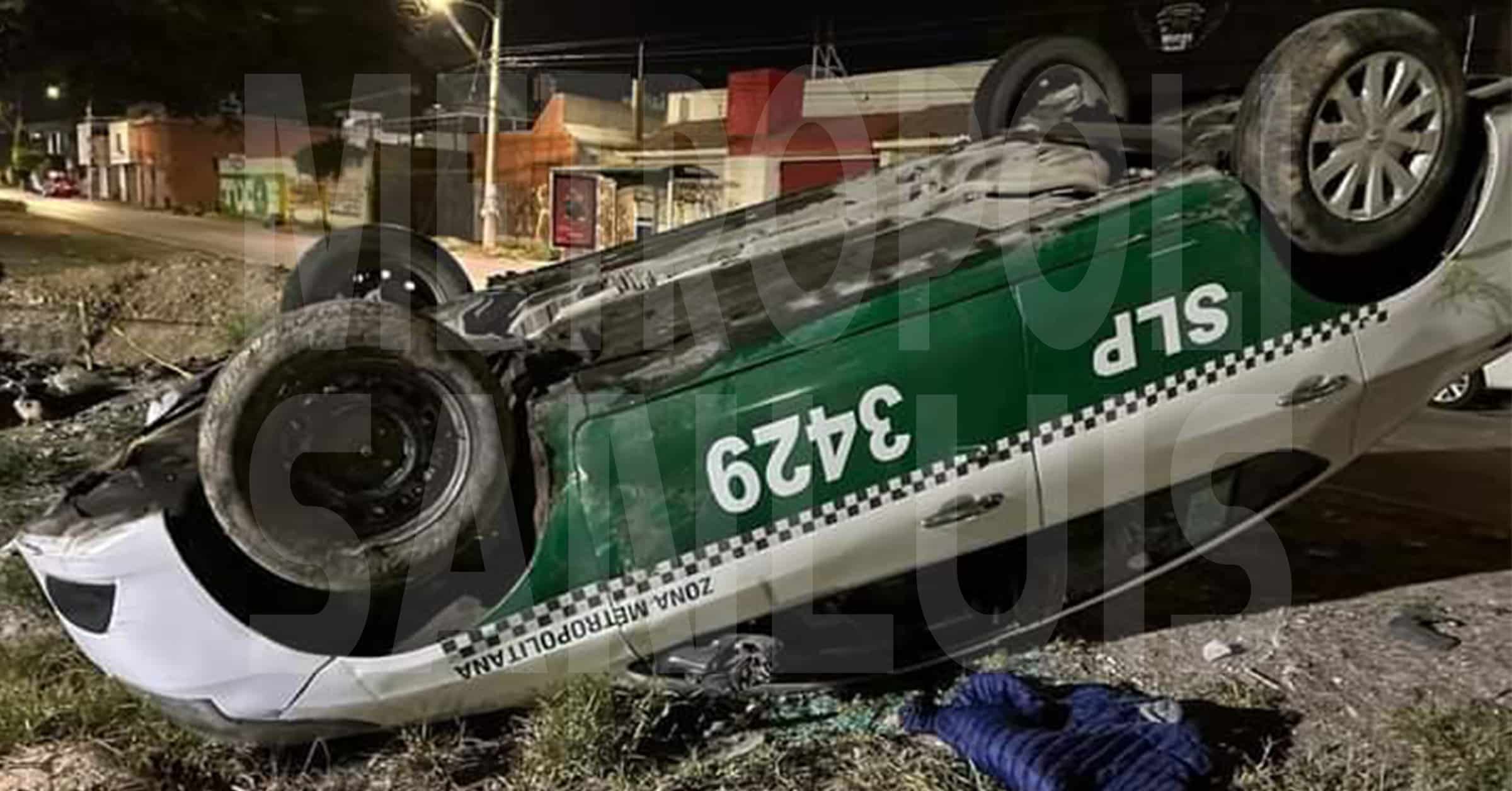 En un incidente ocurrido en la madrugada, un taxi con el número económico 3429 volcó sobre la avenida Hernán Cortes, cerca de la calle Robles en la colonia Privadas de Jacarandas, San Luis Potosí. El vehículo, que quedó con las llantas hacia arriba, fue abandonado cerca de las vías del tren.