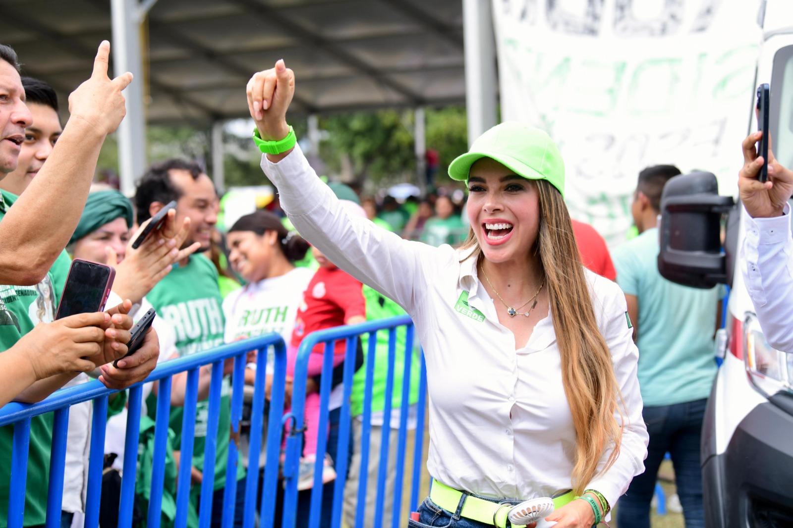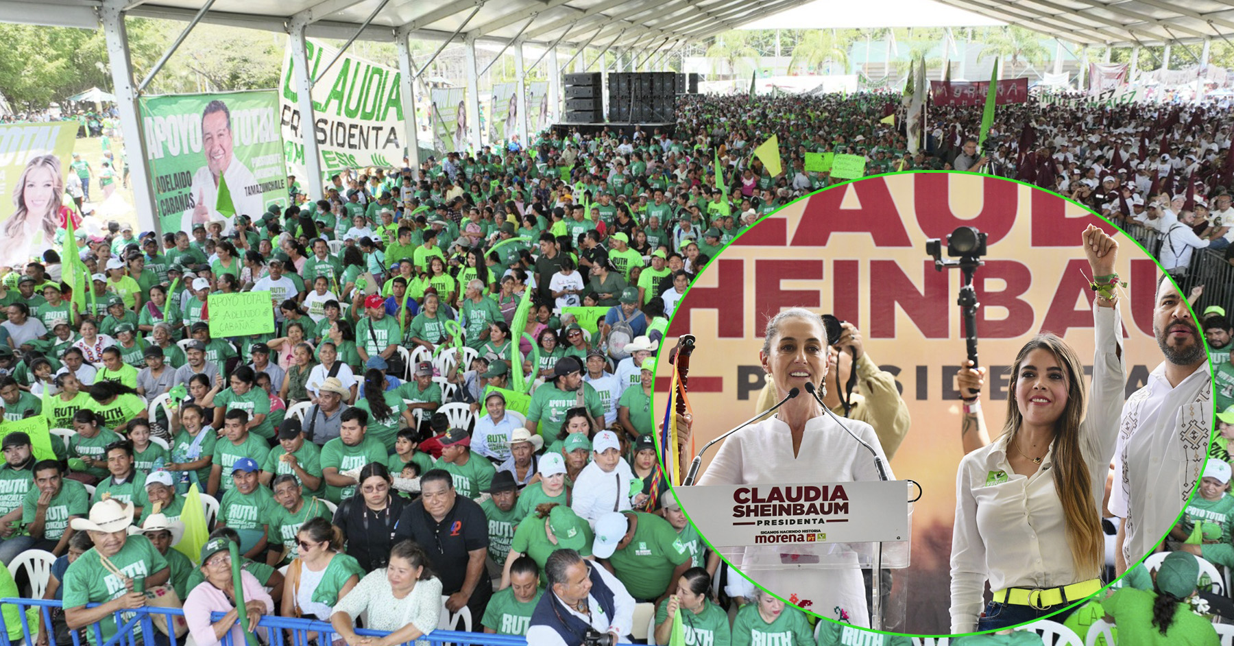 En Tamazunchale, Ruth González Silva y Claudia Sheinbaum Pardo, candidatas del PVEM al Senado y la Presidencia, respectivamente, reciben el bastón de mando de las comunidades tének y náhuatl.