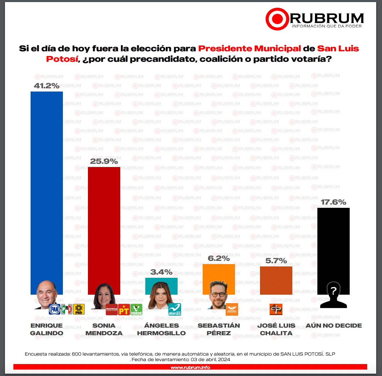 Realizada vía telefónica el 3 de abril, mediante 600 llamadas, la encuesta de Rubrum muestra que un 17.6 por ciento de los encuestados aún no decide su voto para los comicios del próximo 2 de junio. Este dato subraya la importancia de las estrategias de campaña en las semanas previas a la elección, ya que los indecisos podrían inclinar la balanza en cualquier dirección.