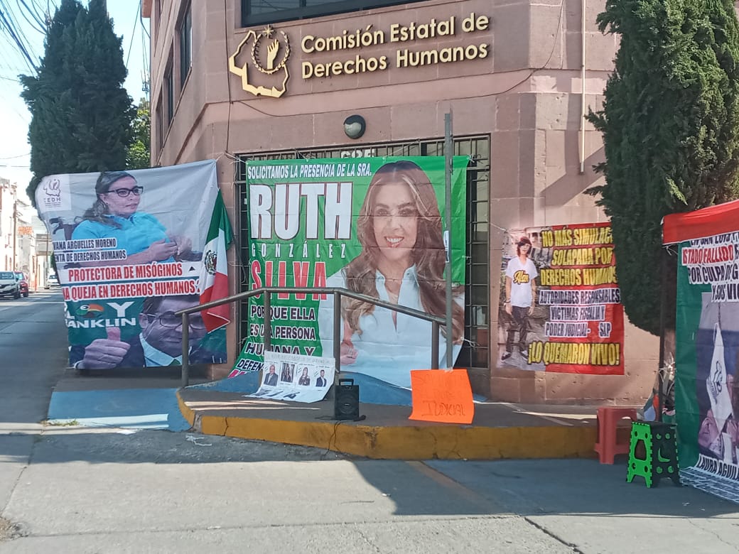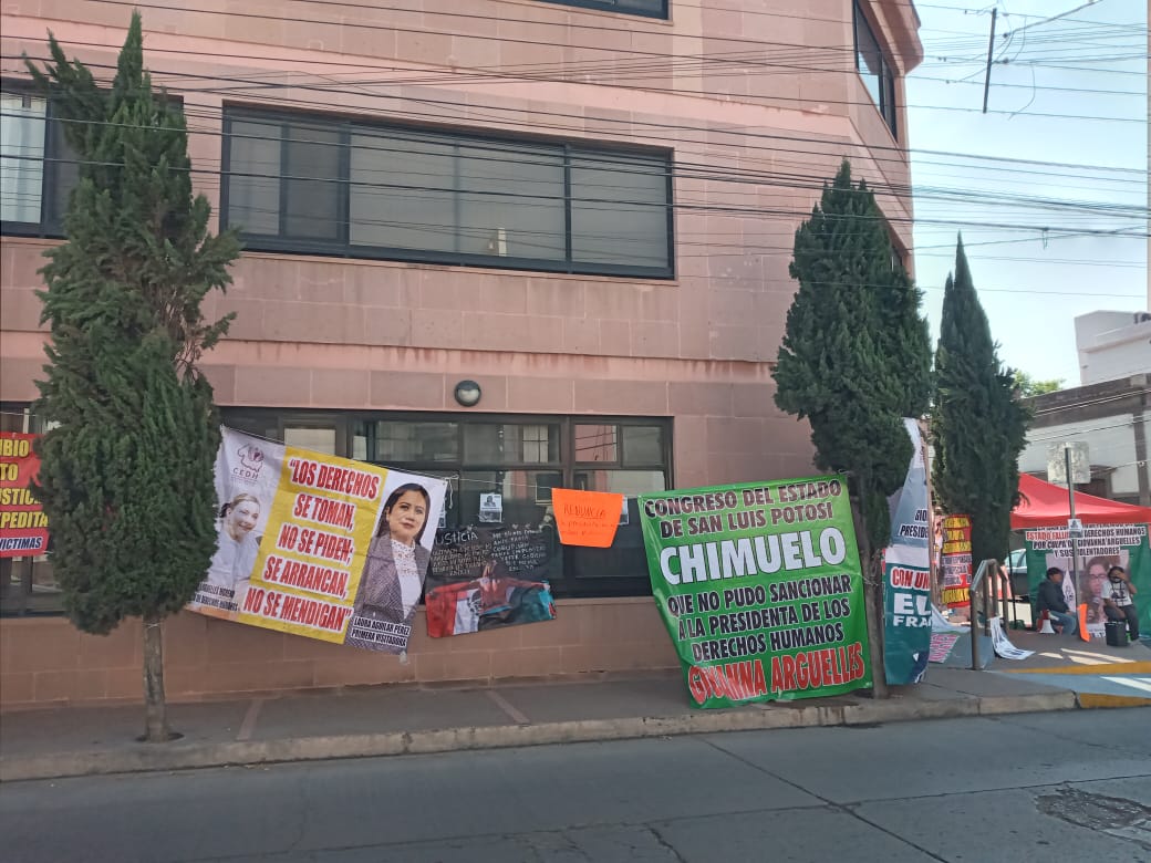 En San Luis Potosí, un grupo de manifestantes se congregó nuevamente frente a las instalaciones de la Comisión Estatal de Derechos Humanos (CEDH) para exigir la renuncia de la titular Giovanna Argüelles y la visitadora Laura Aguilar. El plantón incluyó la colocación de tendederos con consignas demandando un cambio en la dirección de la institución, la cual se encontraba cerrada durante la protesta.