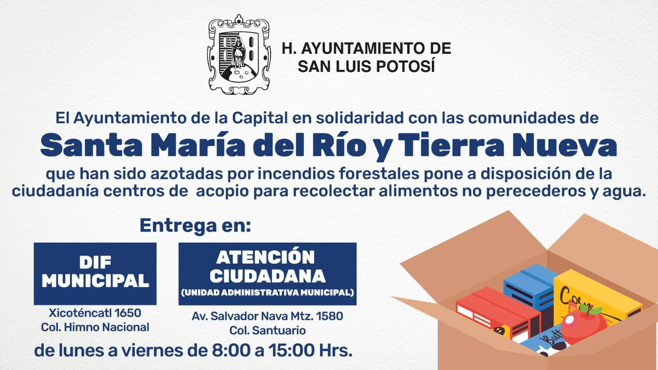 El Gobierno de la Capital ha anunciado la apertura de dos centros de acopio en respuesta a las necesidades de las comunidades afectadas por los recientes incendios forestales en Santa María del Río y Tierra Nueva. Esta iniciativa busca facilitar la recolección de alimentos no perecederos y agua embotellada para ayudar a las familias damnificadas por estos desastres.