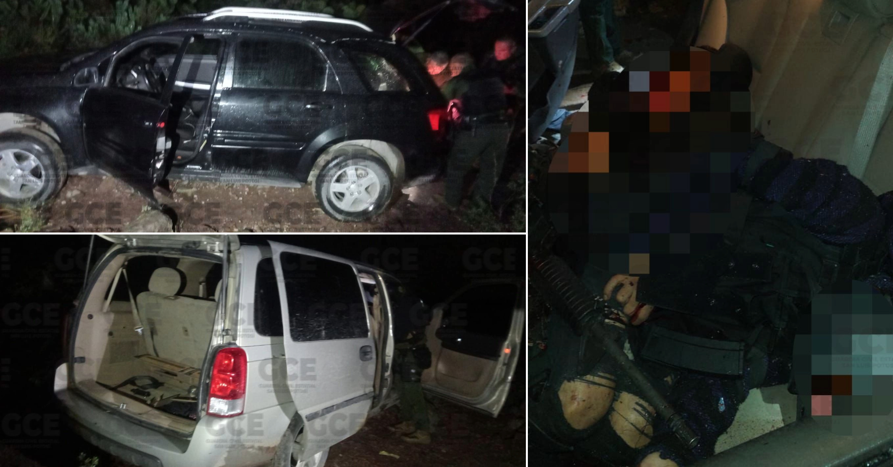 En la escena, se aseguró una camioneta Ford Edge sin placas, equipada con cuatro armas de fuego largas, una corta, cuatro chalecos tácticos, un casco y una bolsa con objetos de varilla. Un segundo vehículo, un Pontiac Torrent negro, fue encontrado en la zona con más equipo táctico y armamento, incluyendo cartuchos de varios calibres y pistolas abastecidas, además de objetos relacionados con actividades delictivas.