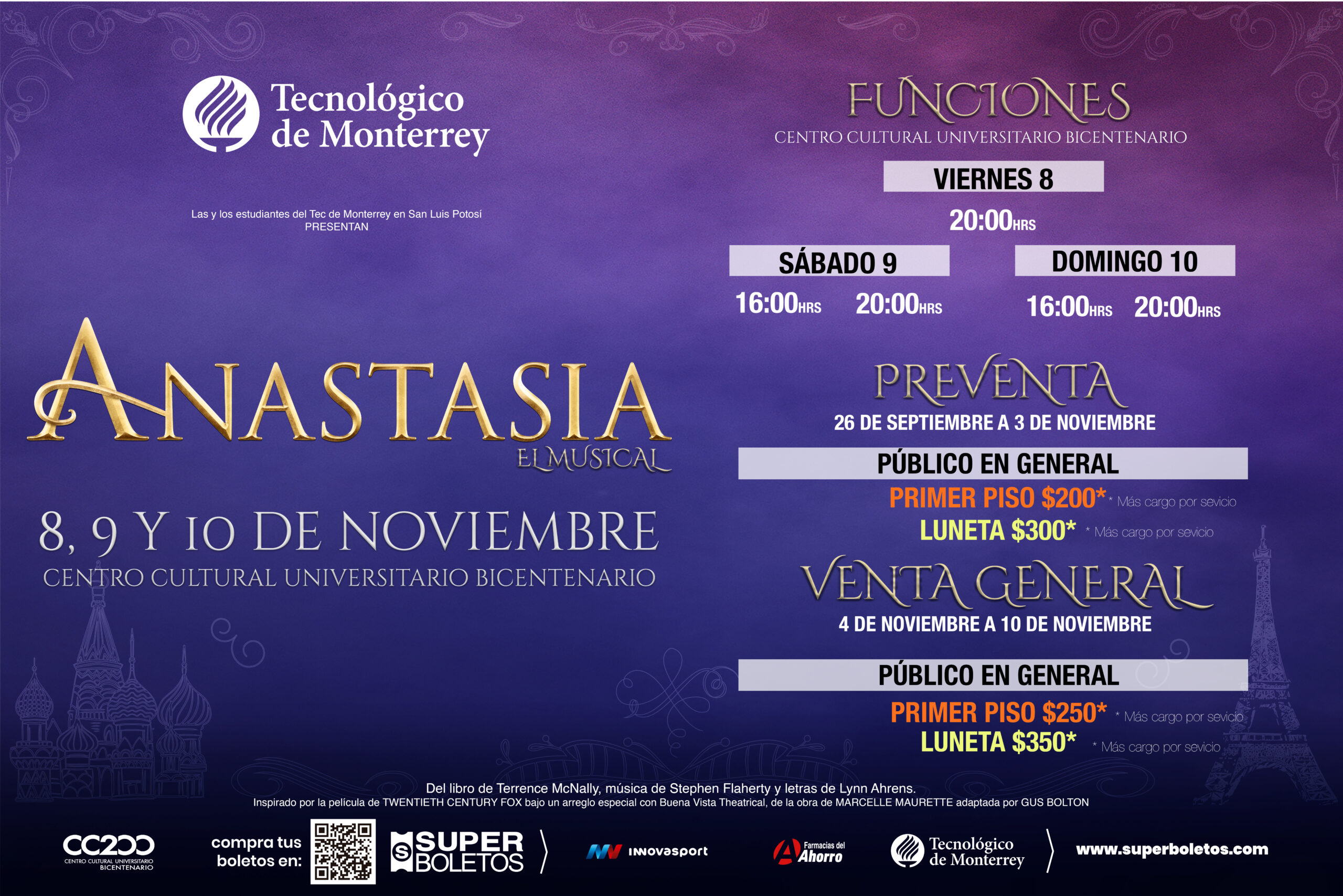 Las funciones de “Anastasia el Musical” se llevarán a cabo en los siguientes horarios: