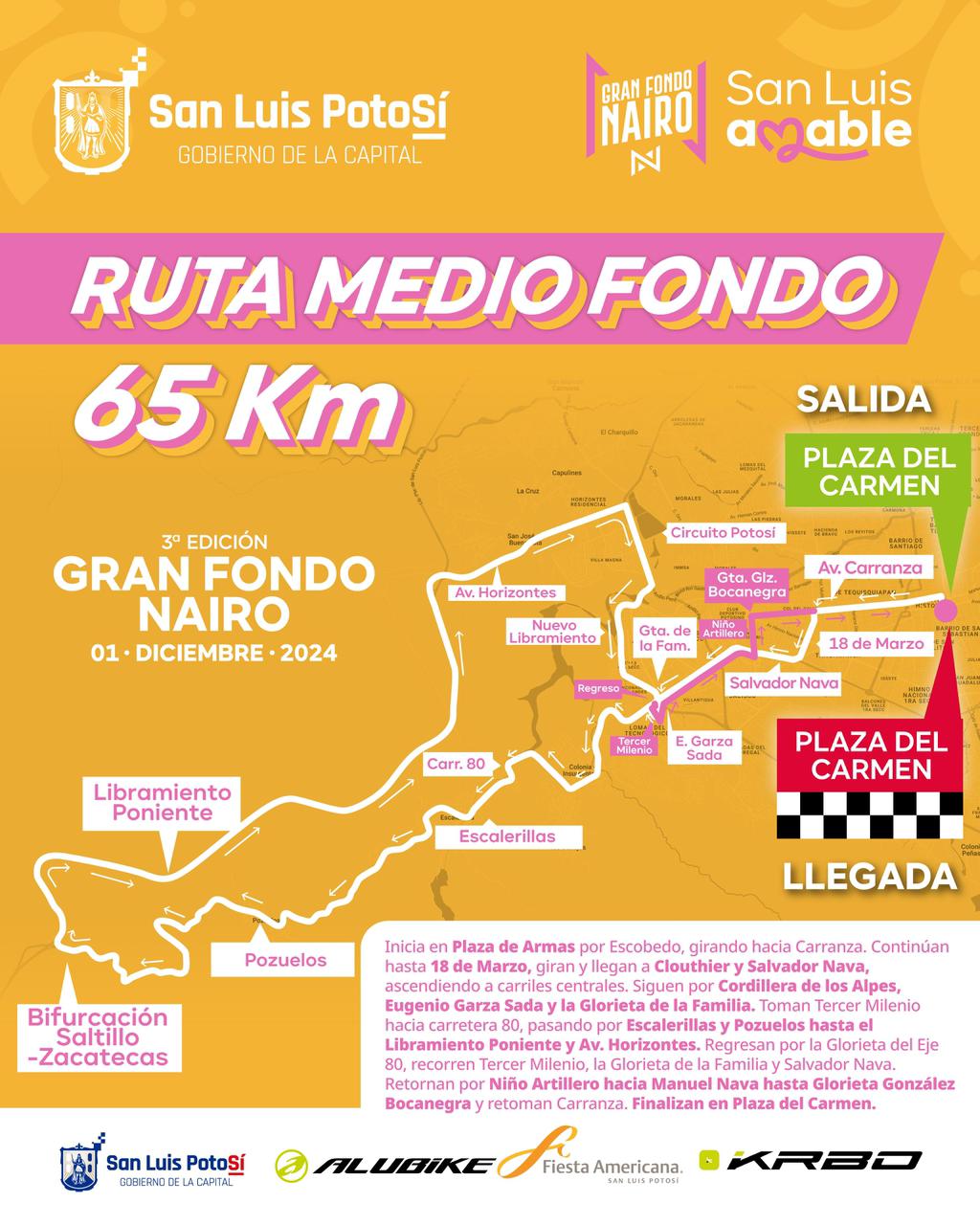 La competencia comenzará a las 7:00 horas en la Plaza del Carmen, con una salida controlada por la calle de Escobedo, avanzando hacia la Plaza de Armas y continuando por avenidas principales como Venustiano Carranza, Salvador Nava Martínez y la carretera 80. El recorrido incluirá comunidades como Escalerillas y Pozuelos, antes de regresar por el Libramiento Poniente y culminar nuevamente en la Plaza del Carmen.