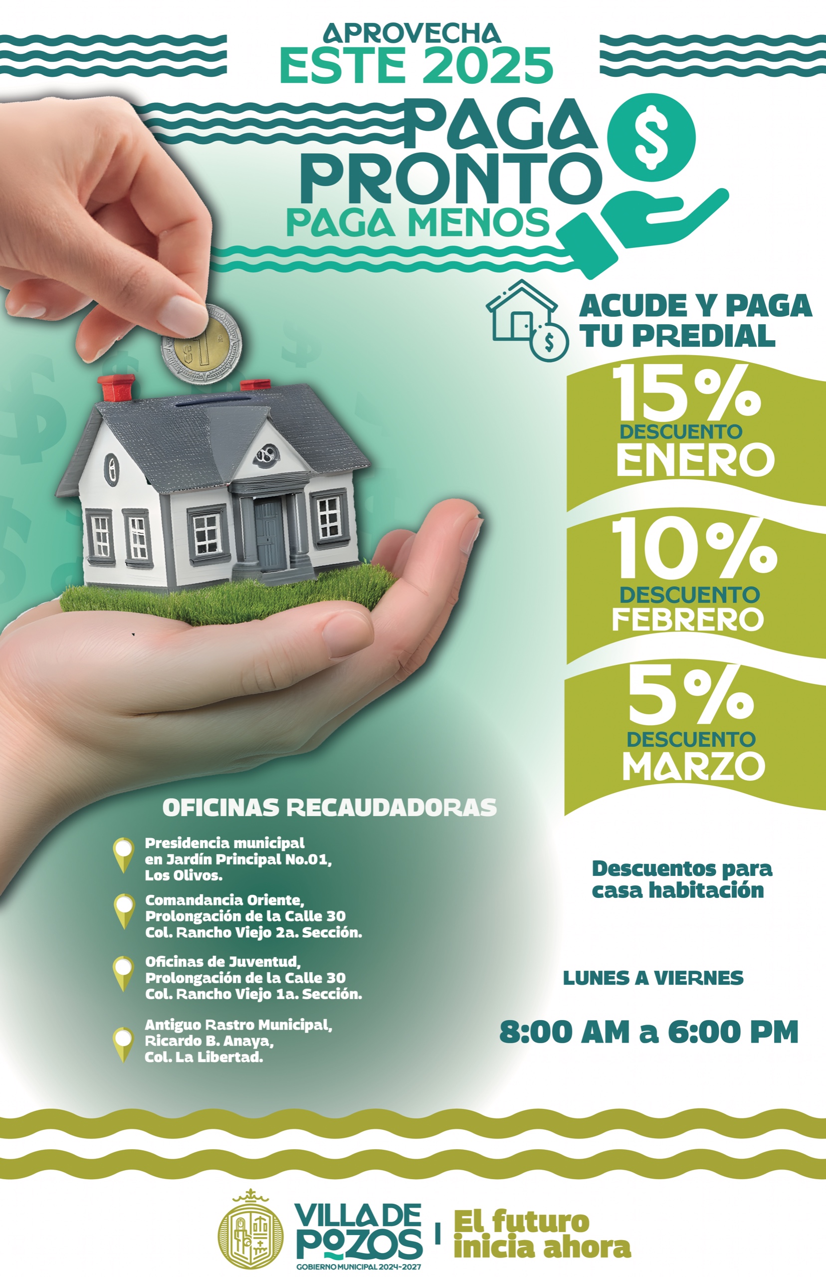 Con el programa “Paga pronto, paga menos”, se otorgarán descuentos del 15% en enero, 10% en febrero y 5% en marzo, exclusivamente para los pagos correspondientes a casa habitación. El horario de atención será de 8:00 a 18:00 horas, en las siguientes ubicaciones: