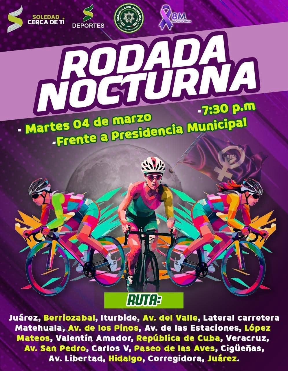 El Ayuntamiento de Soledad de Graciano Sánchez, a través de la Coordinación de Deporte Municipal, invita a la ciudadanía a participar en la tradicional Rodada Nocturna este martes 4 de marzo a partir de las 19:30 horas, reafirmando el compromiso del Alcalde Juan Manuel Navarro Muñiz de estar cerca de las mujeres y fomentar la protección de sus derechos.