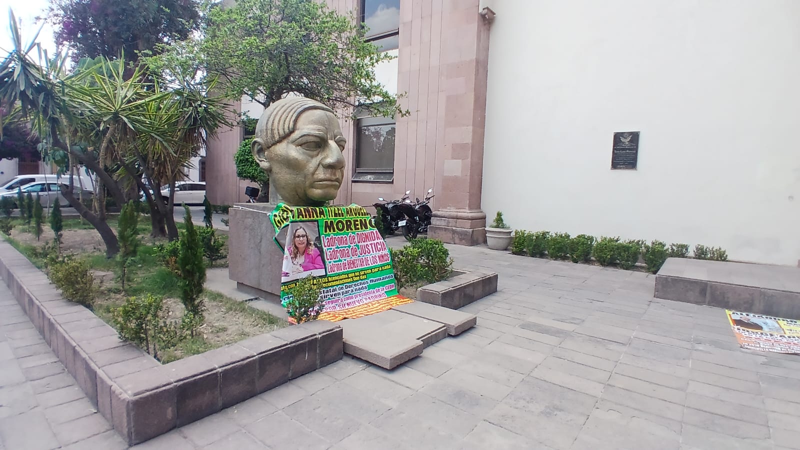 En una de las lonas colocadas en el monumento a Benito Juárez, se le señala como “ladrona de dignidad, de justicia y de bienestar de los niños”.