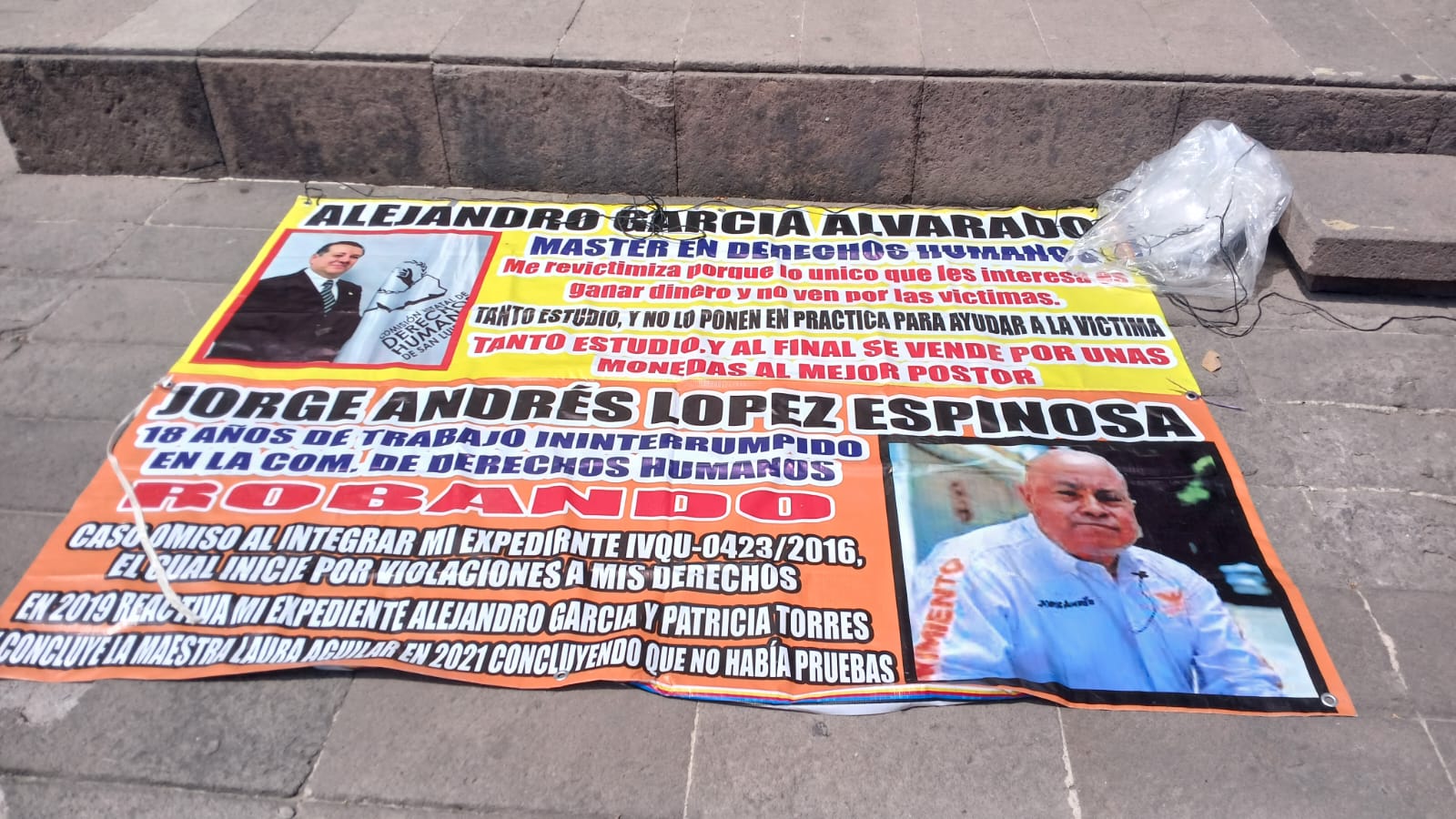 La tercera manta está dirigida contra Alejandro García Alvarado y Jorge Andrés López Espinosa, a quienes responsabilizan de revictimización y de velar por sus propios intereses económicos. De López Espinosa apuntan que lleva 16 años dentro de la CEDH, y lo acusan de “robar” durante su gestión.