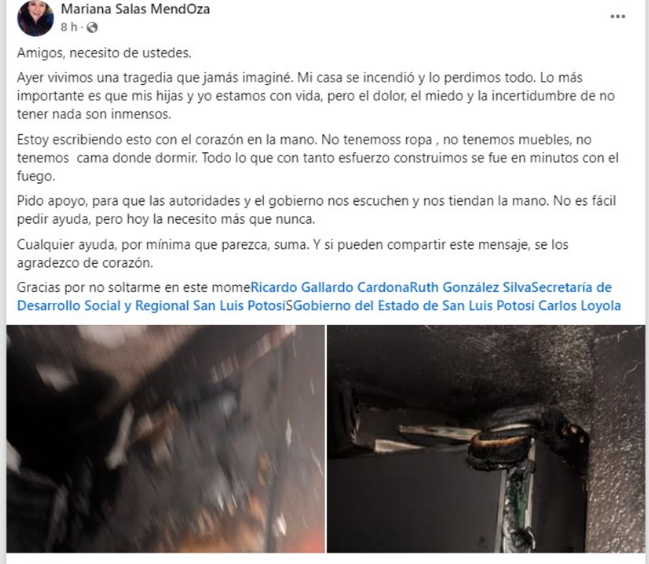 Ante la urgencia de rehacer su vida, Salas Mendoza solicitó el respaldo del gobernador Ricardo Gallardo Cardona, de las autoridades municipales y de “todas las personas de buen corazón”, y compartió una cuenta bancaria de Bancomer (4152 3143 7561 8090) para recibir donativos. “No tenemos ropa, no tenemos muebles, no tenemos cama donde dormir. Todo lo que con tanto esfuerzo construimos se fue en minutos con el fuego”, publicó.