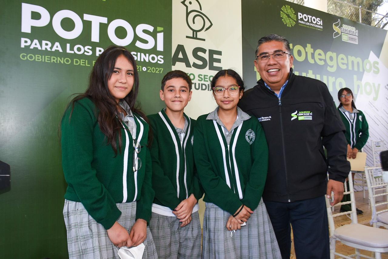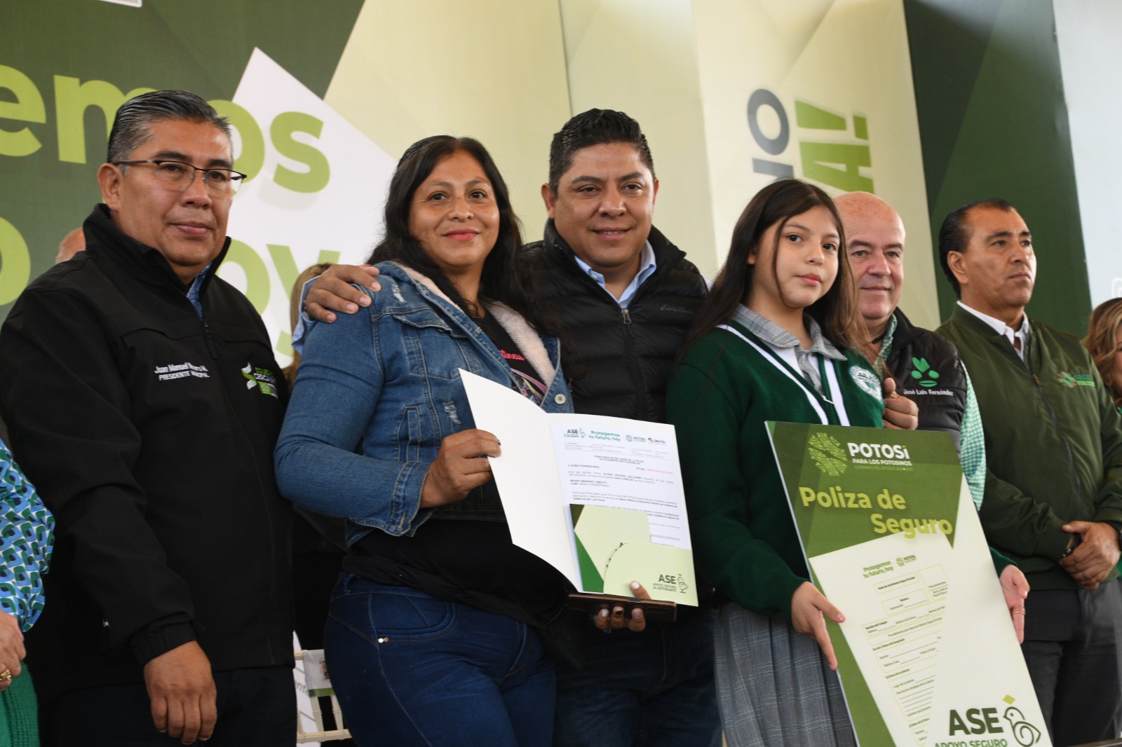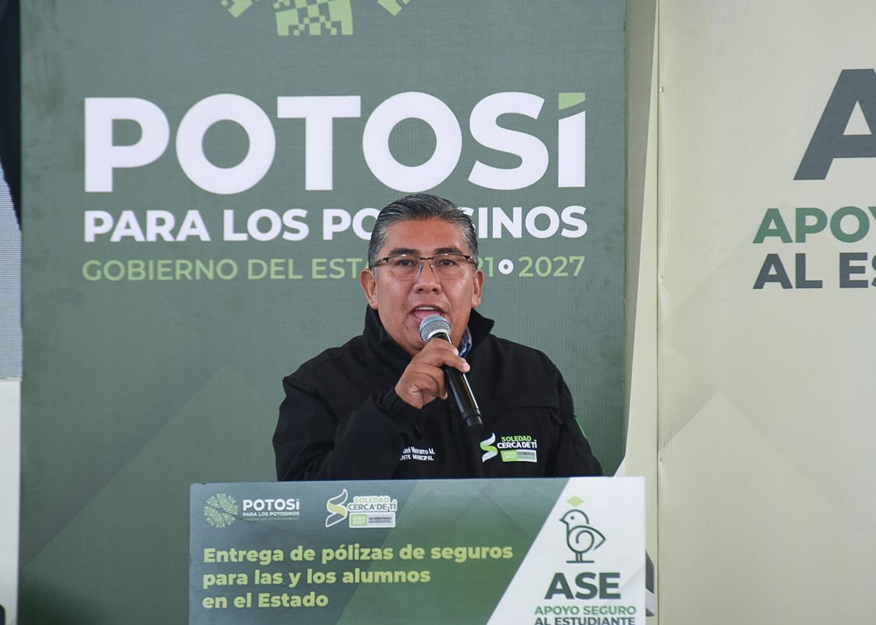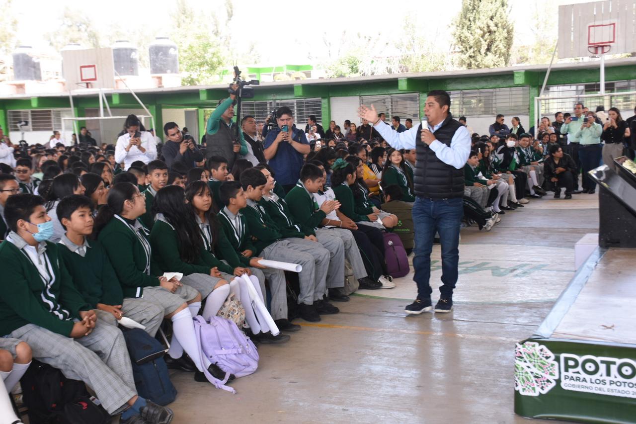 Durante la ceremonia efectuada en las secundarias “Graciano Sánchez Romo” e “Ignacio Altamirano”, el titular del Ejecutivo Estatal, Ricardo Gallardo Cardona, afirmó que “ya está el seguro activo, nuestros estudiantes serán atendidos en los mejores hospitales privados, en caso de requerir atención y servicios hospitalarios”. El Gobernador anunció también la construcción de una cancha de fútbol en la secundaria Ignacio Altamirano, sumando este proyecto al reporte de más de 400 escuelas construidas en el estado.