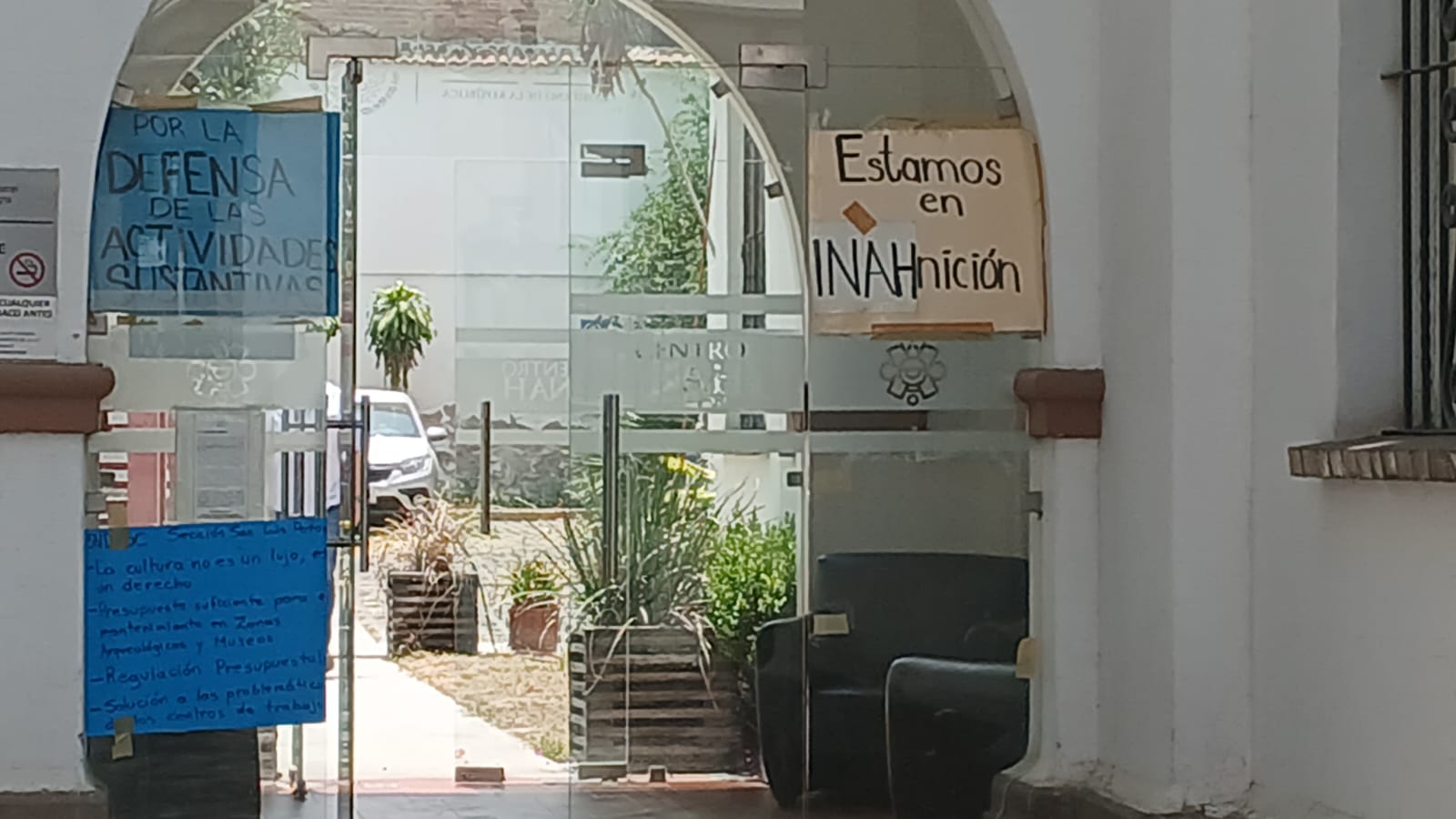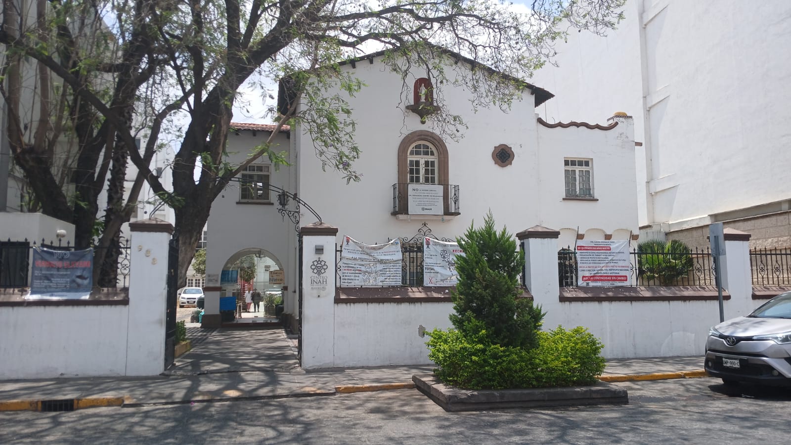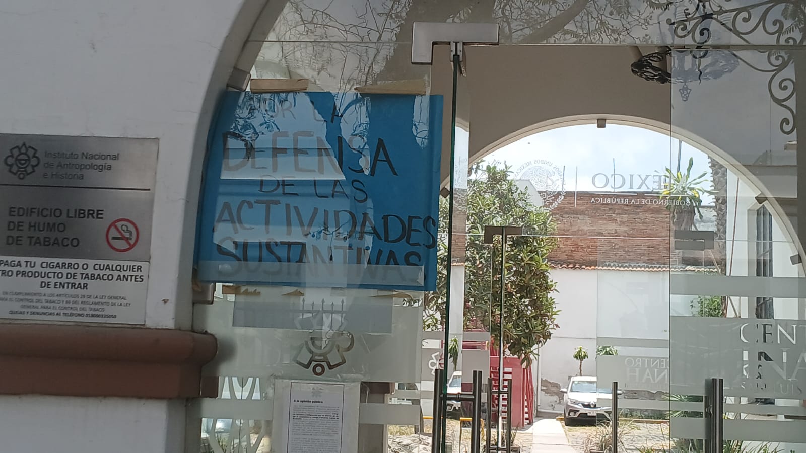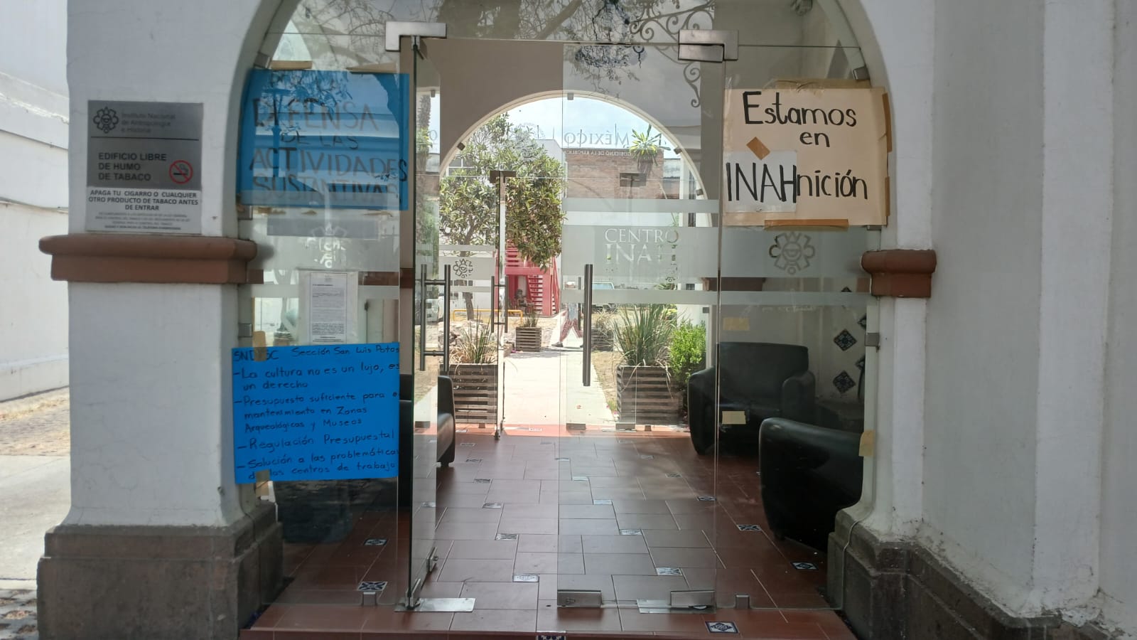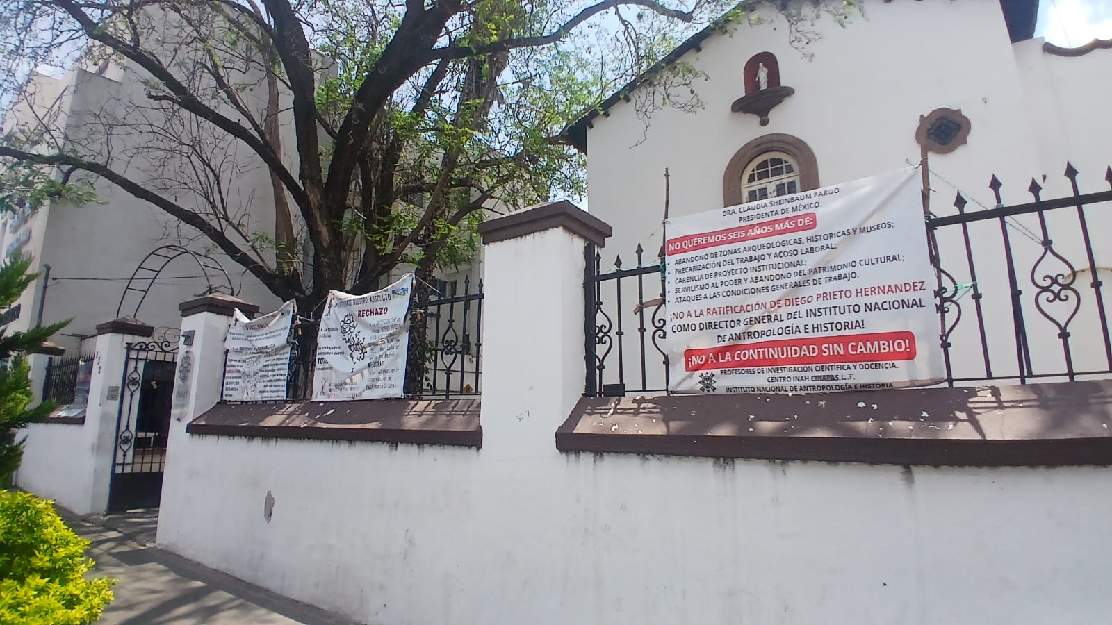El Sindicato Nacional Democrático de Trabajadores de la Secretaría de Cultura colocó mantas de protesta en el Centro INAH para exigir financiamiento digno, respeto a derechos laborales y defensa del patrimonio histórico