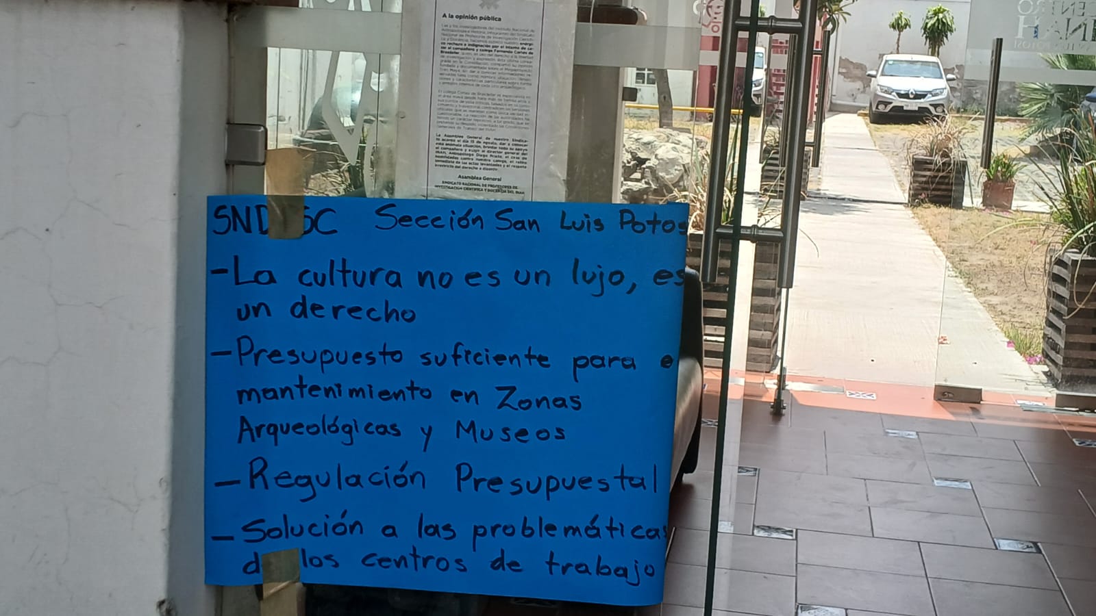 “Exigimos presupuesto cultural suficiente y la regulación presupuestal de nuestros centros de trabajo”, se lee en una de las pancartas, colocada junto al acceso principal.