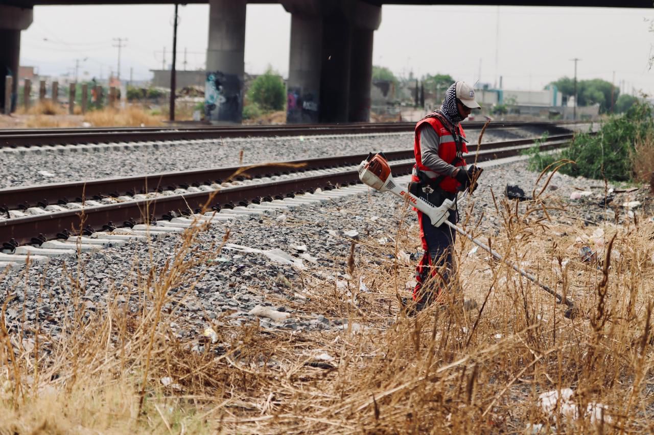 • Limpieza y retiro de maleza en áreas verdes y aledaños a las vías del ferrocarril México–Laredo.