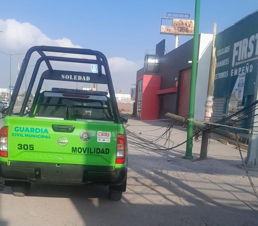 Tras el derribo de dos postes de alumbrado en el Bulevar Valle de los Fantasmas, a la entrada del fraccionamiento Privadas de la Hacienda, personal de Protección Civil Municipal y de Seguridad Vial y Movilidad del Ayuntamiento de Soledad de Graciano Sánchez acordonó la zona y estableció un dispositivo para agilizar el tránsito, a fin de prevenir riesgos para peatones y automovilistas.