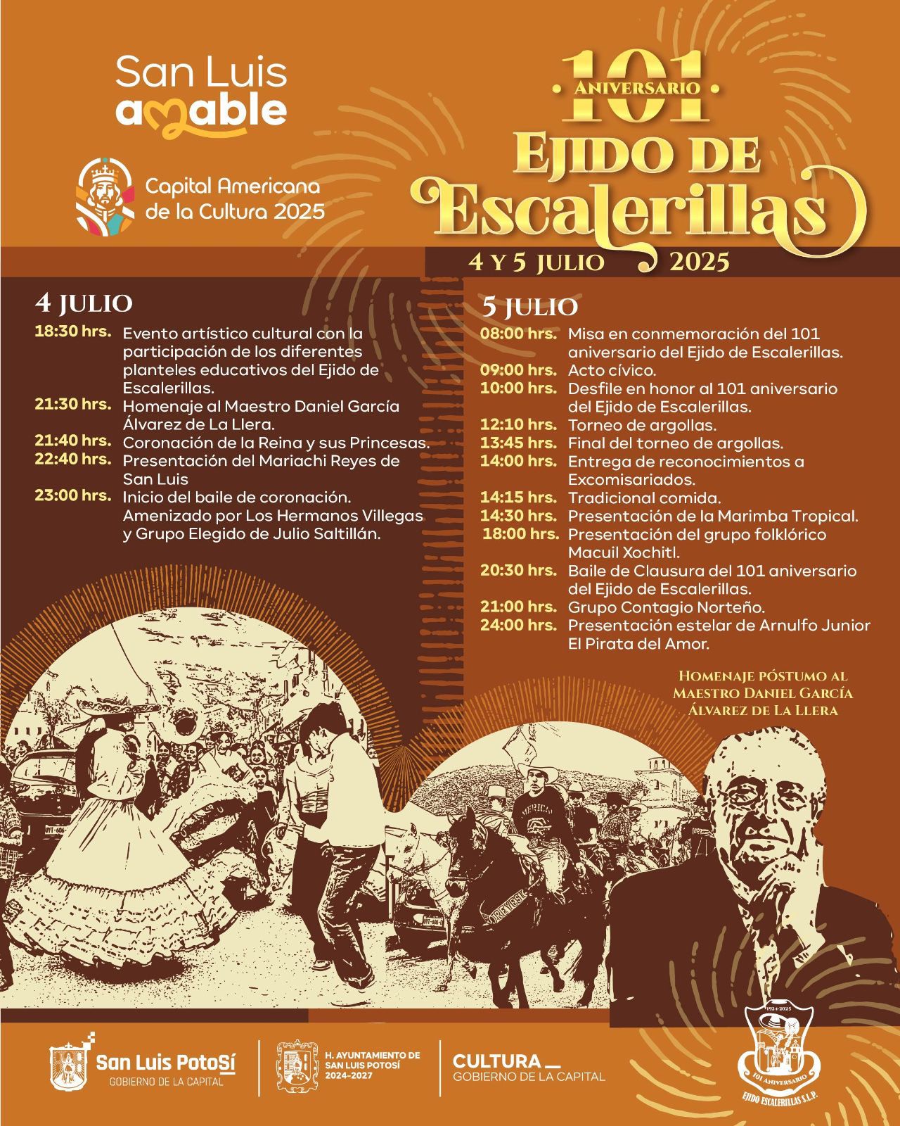 Del 4 al 5 de julio, el Ayuntamiento de San Luis Potosí y el comisariado ejidal ofrecerán música en vivo, desfiles, torneos tradicionales y un homenaje póstumo al promotor cultural Daniel García Álvarez de la Llera, en el marco de la designación de la ciudad como Capital Americana de la Cultura 2025.