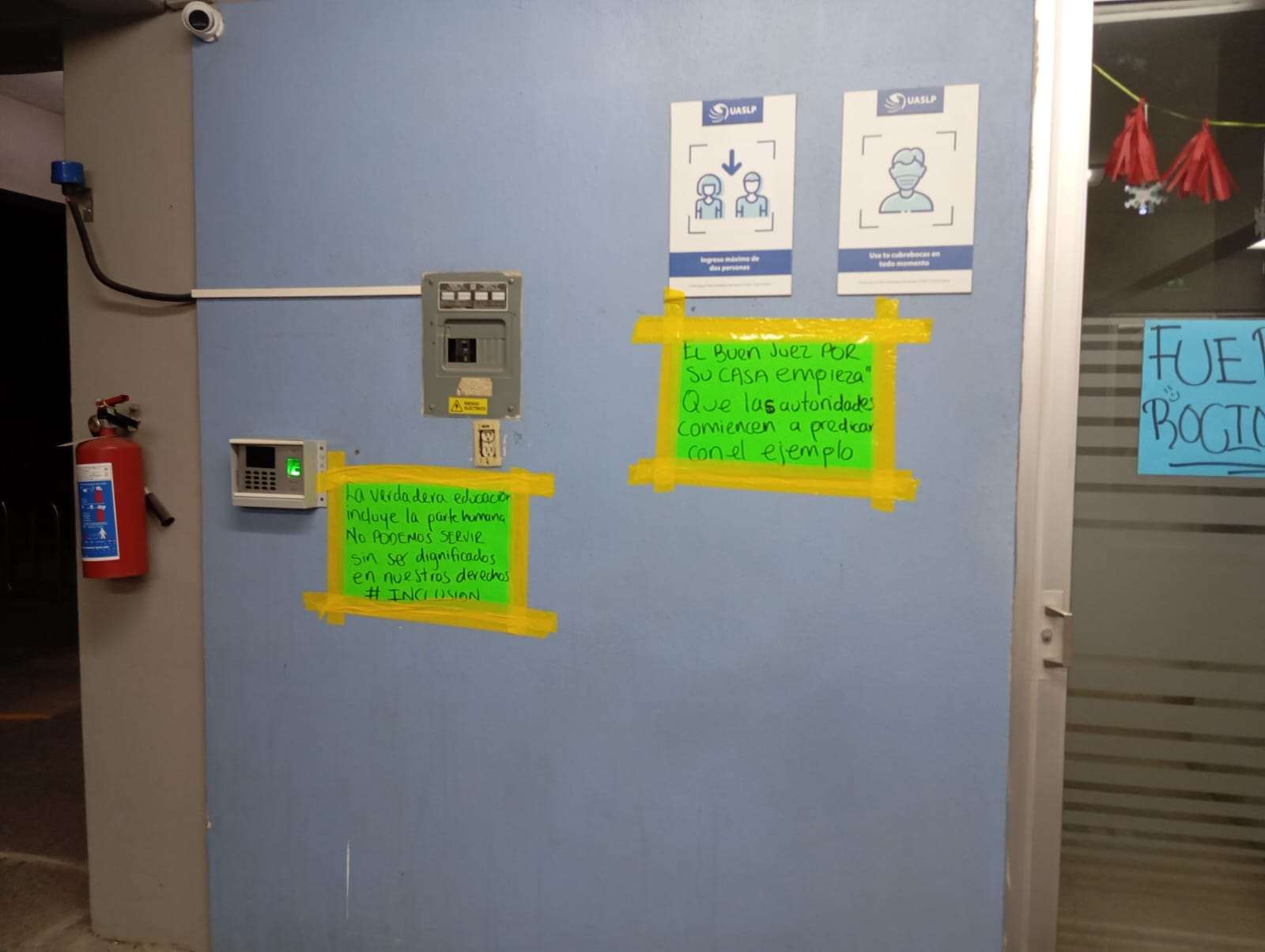 Asimismo, manifestaron su inconformidad por la contratación de personal externo ajeno a la UASLP, en particular de Lorena Torres Martínez, encargada del departamento de Recursos Humanos, quien —señalan— fue contratada con recursos propios de la FCI, en medio de la crisis financiera que actualmente enfrenta la UASLP.