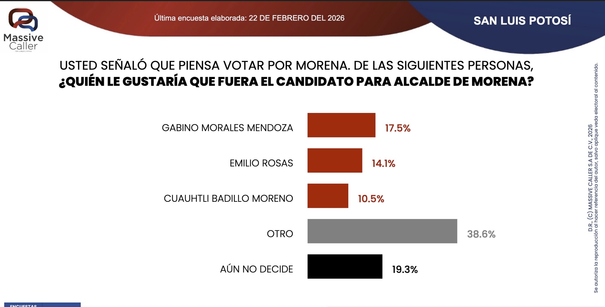 En el apartado de posibles aspirantes de Morena a la alcaldía, Gabino Morales Mendoza aparece con 17.5%, seguido por Emilio Rosas con 14.1% y Cuauhtli Badillo Moreno con 10.5%. En este bloque destaca que 38.6% menciona a otro perfil y 19.3% permanece indeciso.