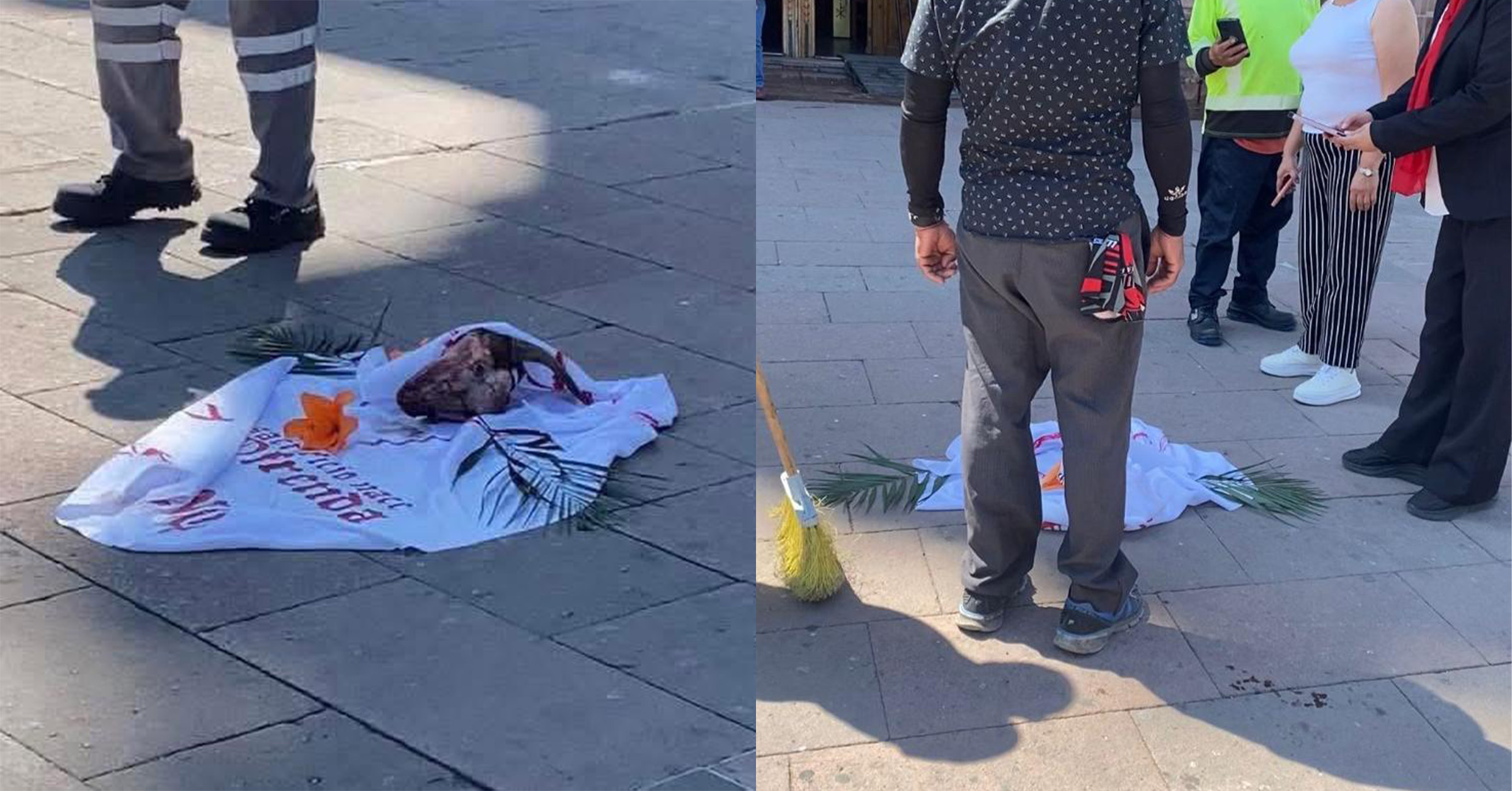 De acuerdo con reportes de personas que se encontraban en el lugar, el objeto estaba envuelto en una manta blanca y acompañado de algunas ramas. Además, tenía escrita una frase visible que decía: “El sacrificio se hace ofrenda”, lo que incrementó la extrañeza entre los asistentes que participaban en las celebraciones religiosas.