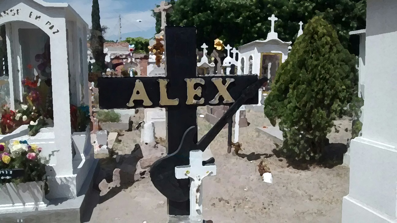 La tumba llama a la atención por tener una guitarra eléctrica de color negra y el nombre de “Alex” , además de un ofrendas como cigarros y botellas de cerveza.