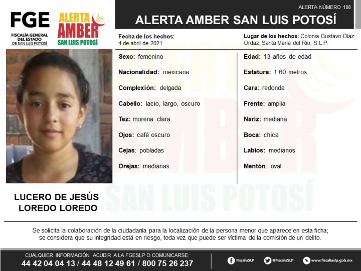 Cualquier información sobre su paradero, favor de acudir a la FGESLP, en su edificio Central de Eje Vial 100, en la zona Centro de San Luis Potosí, o comunicarse a los teléfonos 444 812 49 61 y/o al 800 75 26 237 lada sin costo.